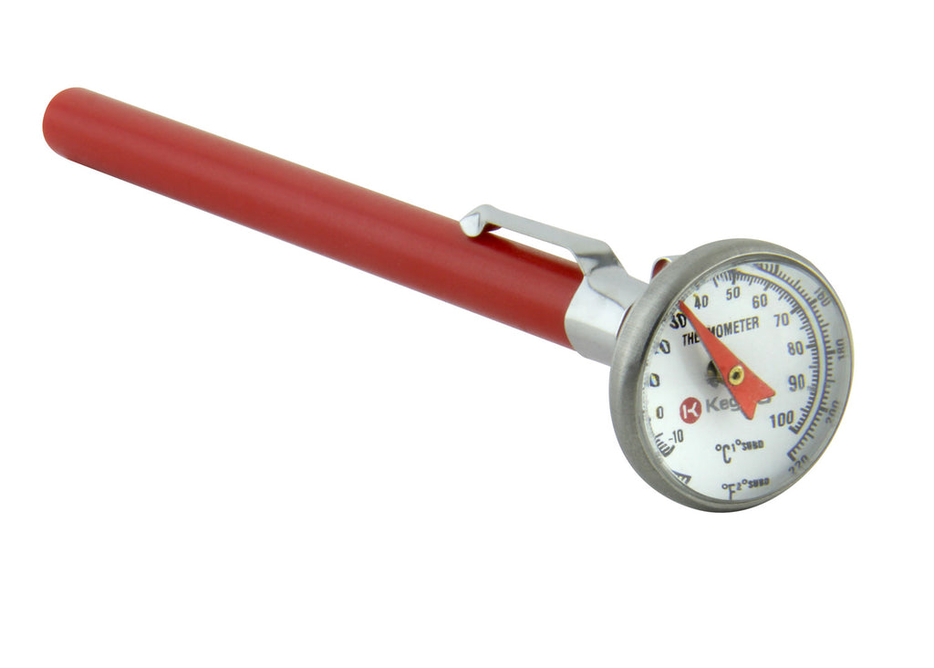 This convenient Kegco Pocket Dial Thermometer allows you to easily monitor the temperature of your boil. It has a 1" face marked in Fahrenheit and Celsius and a 0-220 degree Fahrenheit (-10-100 degree Celsius) temperature range. The 5" probe and water-tight lens help prevent damage during use. Thanks to the pocket clip, it is easy to keep it with you.