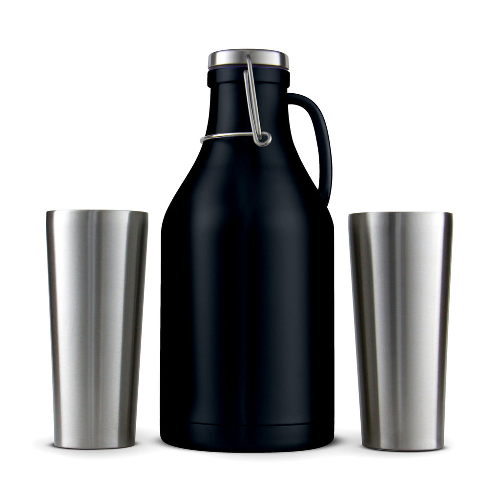 This Black Growler and Stainless Steel Pint Glass Set makes it easier than ever to share your favorite beverages with friends and family. The 64 oz. stainless steel beer growler is the perfect size to fill up the two 16 oz. stainless steel pint glasses to make sure everyone gets their share!