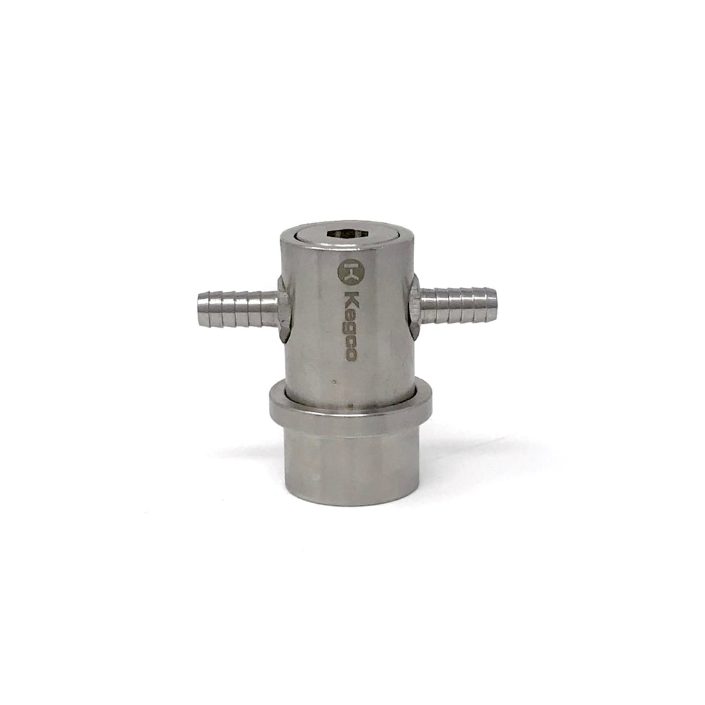 This machined stainless steel ball lock coupler was developed for a Daisy Chain Bag in Box dispense system. It features two opposing 1/4" barbs on one ball lock coupler.