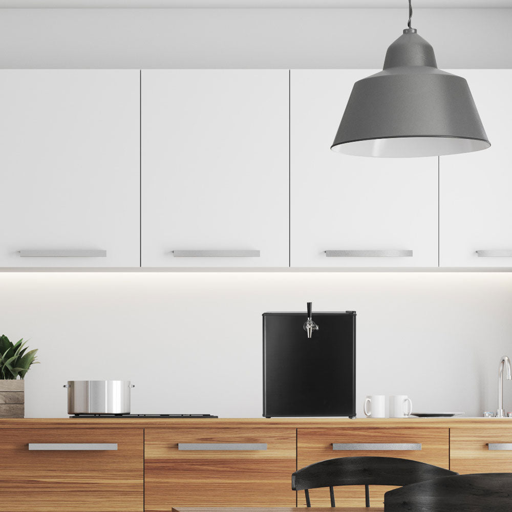 The sleek and compact design allows this kegerator to sit on a counter top without taking up space and can be easily moved as needed. This small counter top kegerator is an exclusive Kegco design and allows bars, restaurants, home bars, and kitchens to easily incorporate a kegerator despite space limitations. Easily plugs into a standard electrical outlet and low-profile design allow it to seamlessly integrate into most spaces.
