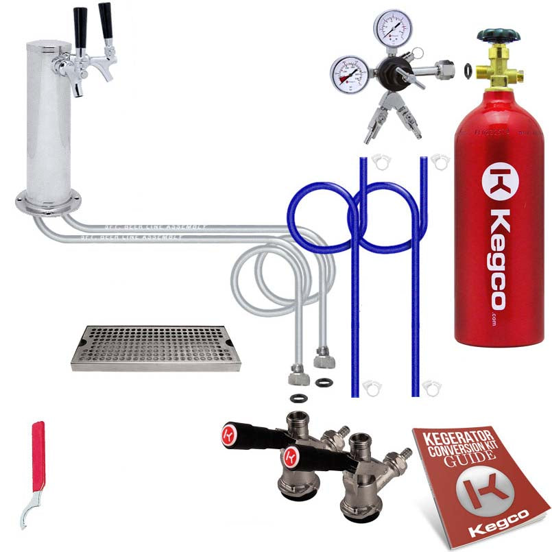 Kegco's Deluxe Two Keg Tower Kegerator Conversion Kit gives you the power to transform a plain compact refrigerator or chest freezer into an exciting high-performance two product draft beer dispenser. We've drawn on years on beer dispensing experience to design a conversion kit that comes complete with all of the high quality parts you'll need, including NSF approved commercial-grade components like a commercial grade double gauge two product regulator and two American D system keg couplers. A beautiful 3" diameter stainless steel draft tower with two chrome plated faucets gives your completed kegerator an elegant look, while a stainless steel drip tray helps keep mess to a minimum by catching any drips or spills. Your finished kegerator will be able to dispense up to two separate kegs depending on your refrigerator's capacity.