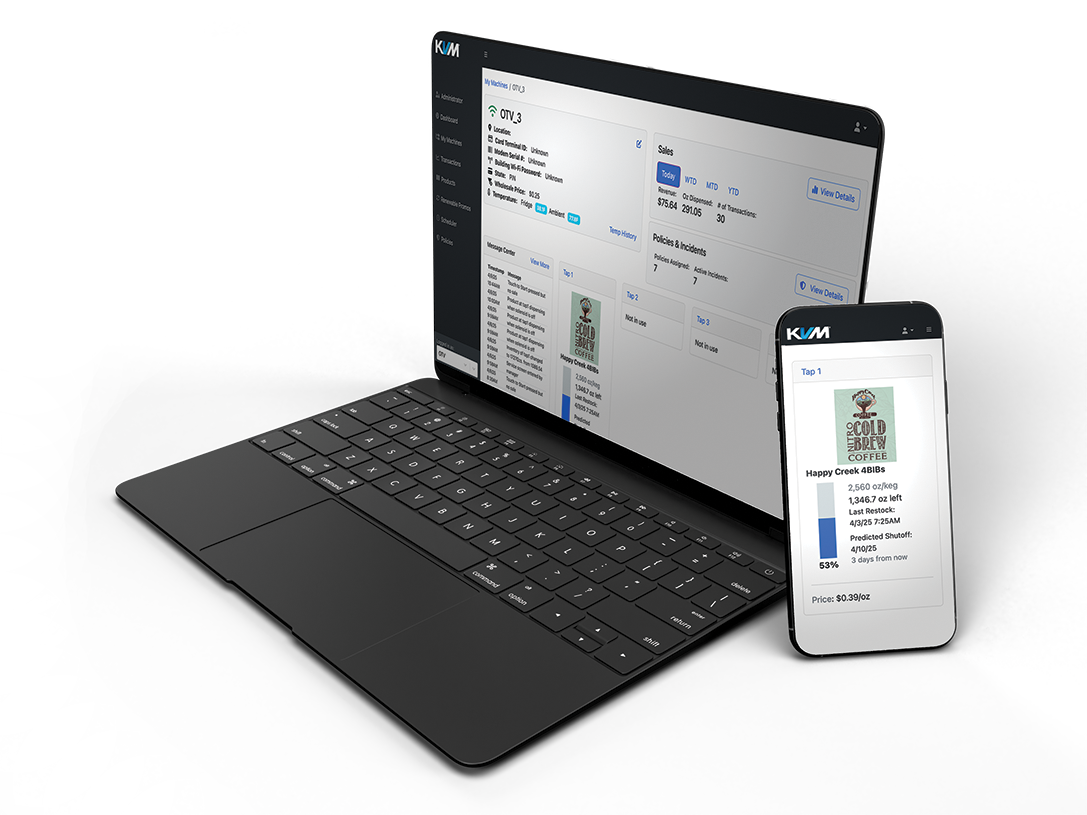 Taps are activated via a 6-digit code entered on the KVM touchscreen, generated through the KVM Dashboard. Each code can have a set ounce limit, usage type, expiration date, and optional auto-renewal daily, weekly, or monthly.
