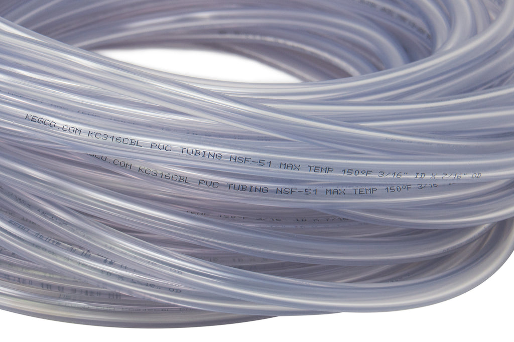 The Kegco 100 foot length of 3/16" I.D. thermopalstic vinyl beer tubing exceeds all of the rigid demands for beer dispensing systems and is a brewery approved beverage hose. This beer line remains flexible and durable at recommended pressures and temperatures and will not rot, swell, or dry out. This clear thermoplastic tubing can be easily cleaned and is unaffected by normal cleaning compounds.