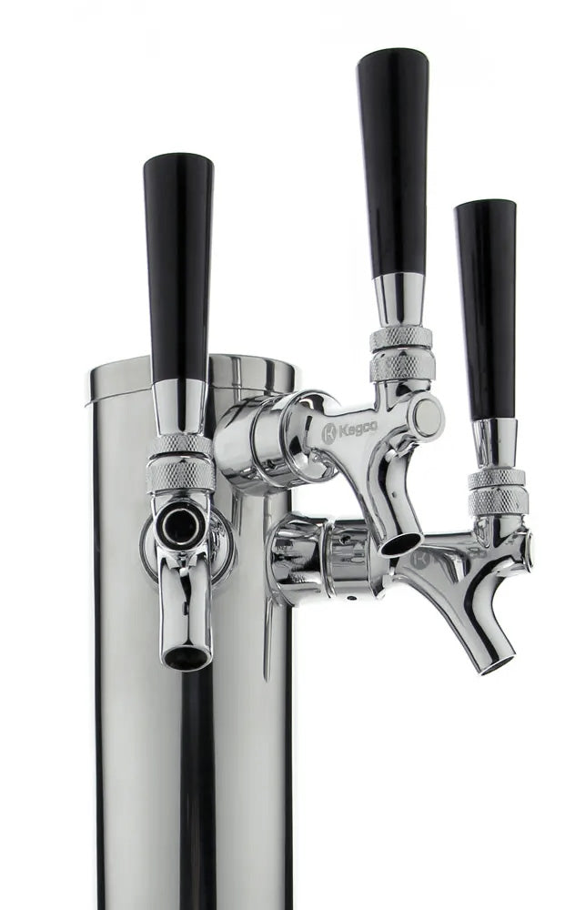 - Kegco's draft beer tower comes equipped with three stainless faucets with stainless levers and three black ABS plastic faucet knobs