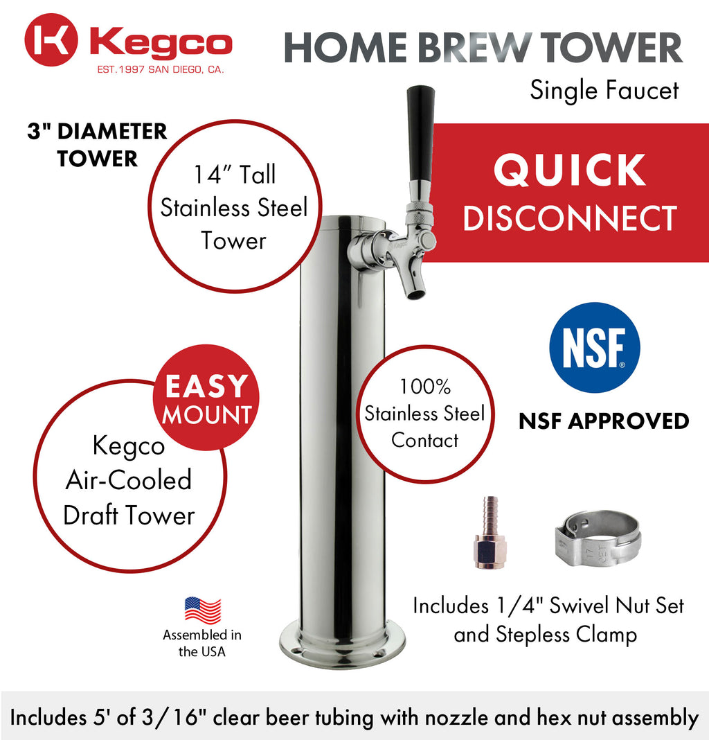 Kegco's 14" Tall Polished Stainless Steel 1-Tap All Stainless Contact Quick Disconnect Homebrew Tower is designed with the homebrewer in mind! It includes quick disconnect MFL fittings that allow you to easily connect and disconnect the beer line from a home brew coupler, and features 100% stainless steel contact components to ensure the purest taste for your home brewed beer. The tower's extra-tall 14" height gives you enough space to fill normally hard-to-fit growlers and pint glasses.