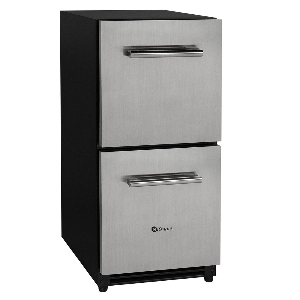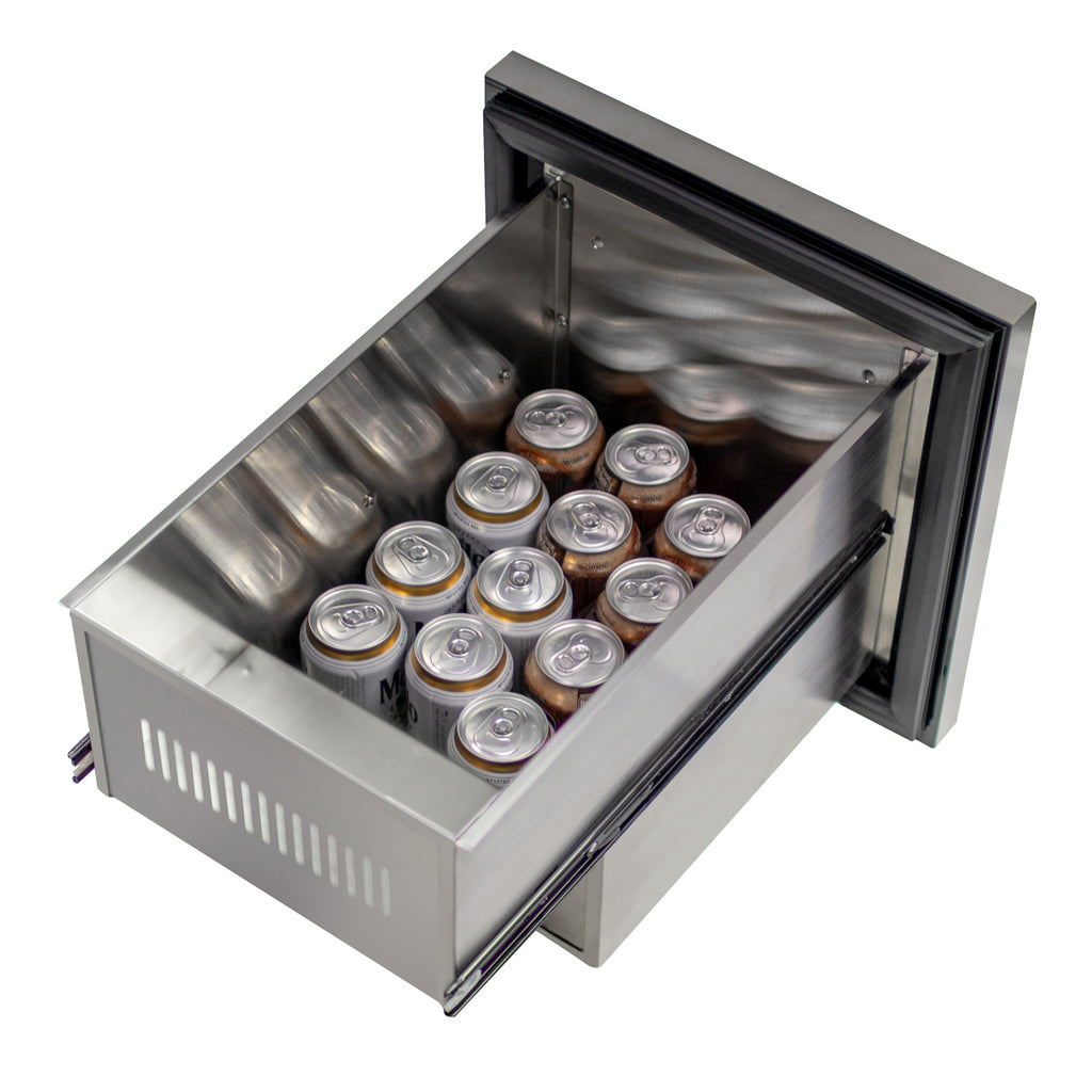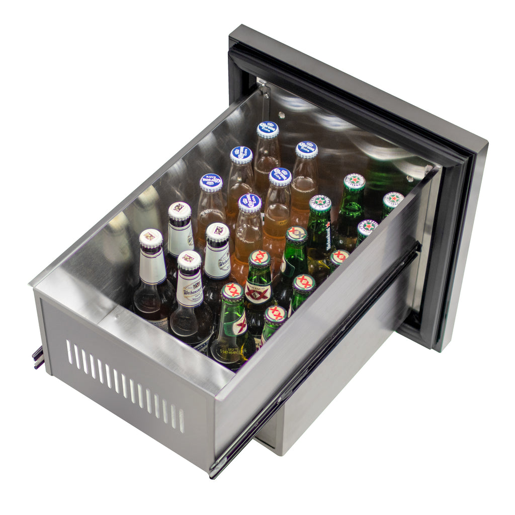 Two drawers | Top drawer can hold up to 24 cans or 28 bottles. Bottom drawer can hold up to 40 cans or 20 bottles. Capacity is based on standard 12oz. cans or 22oz. beer bottles at 11" tall.
