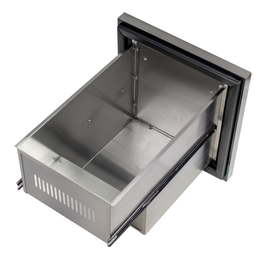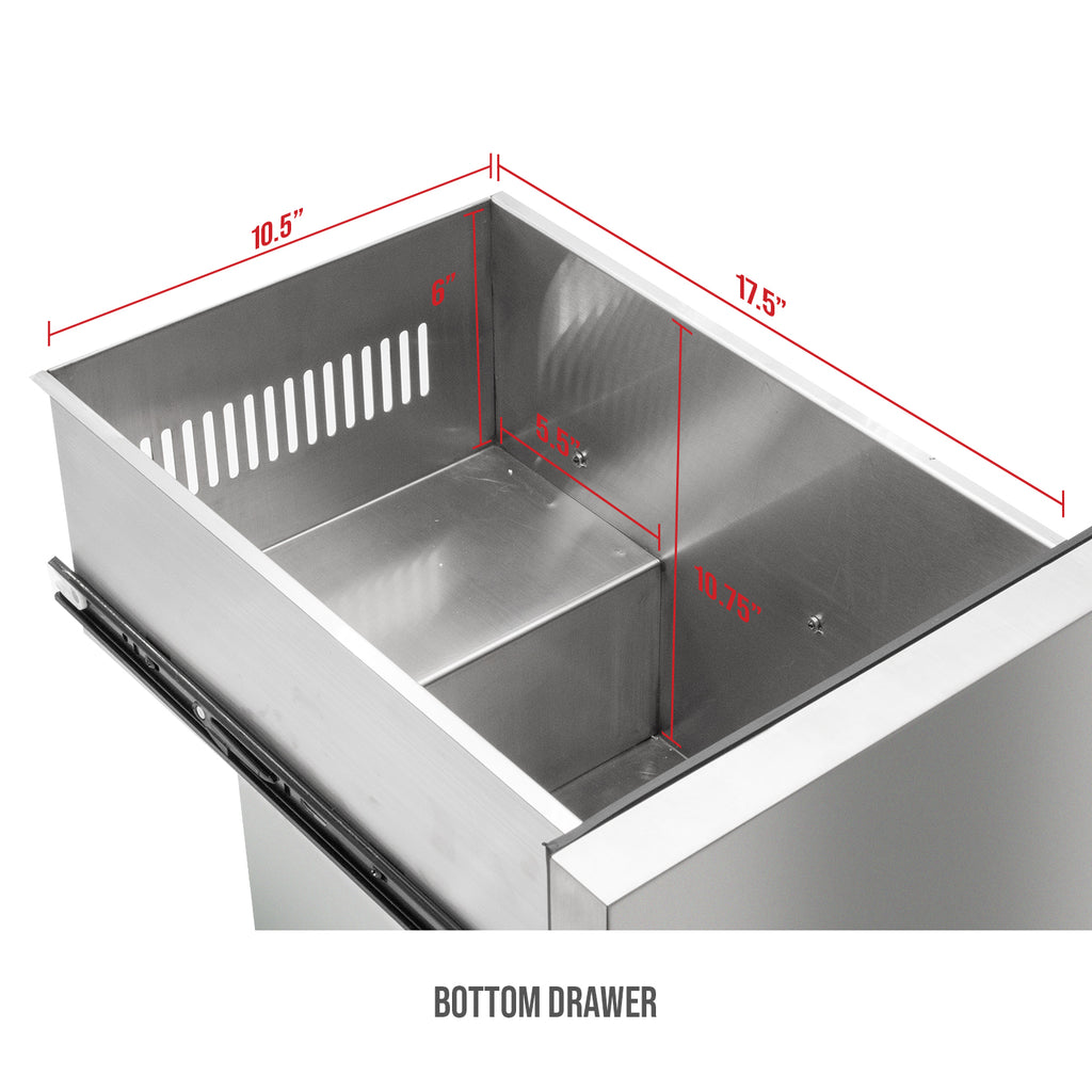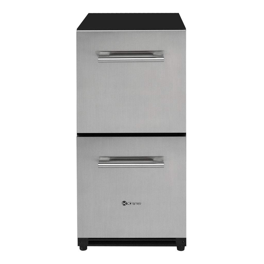 Two drawers | Top drawer can hold up to 24 cans or 28 bottles. Bottom drawer can hold up to 40 cans or 20 bottles. Capacity is based on standard 12oz. cans or 22oz. beer bottles at 11" tall.