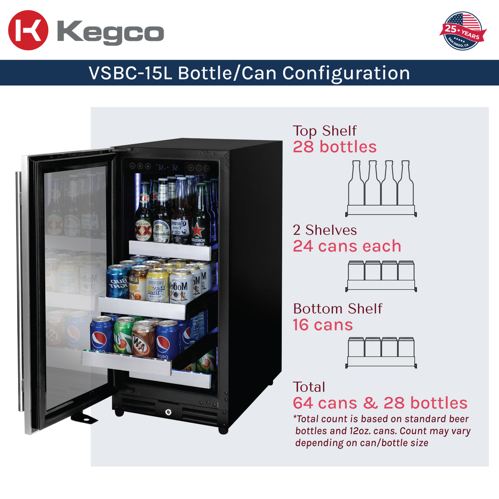 - Kegco 15" Wide Beverage Center features durable metal ball bearing shelves that fully extend for easy access