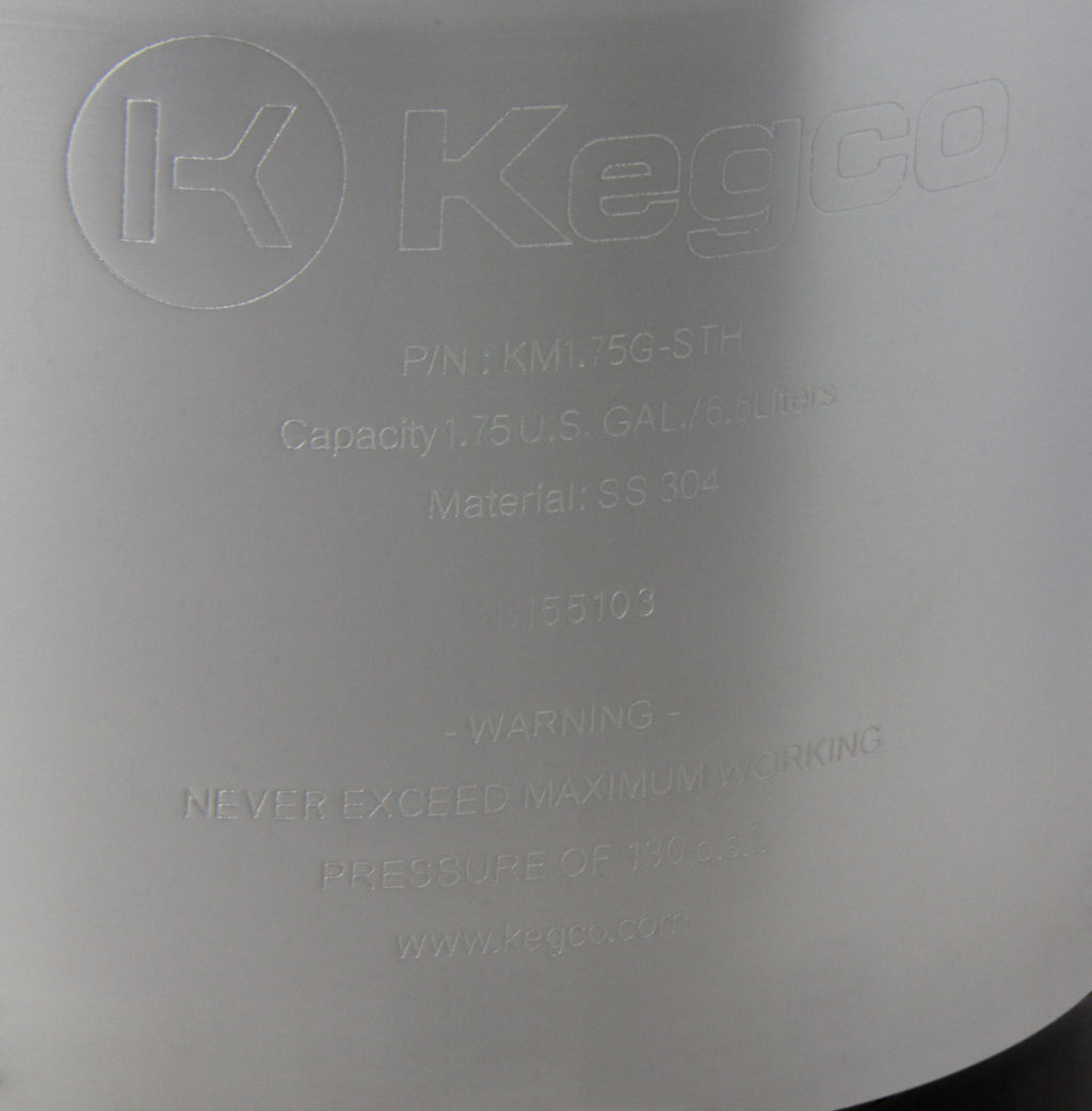 This Kegco KM175G-STH 1.75 gallon stainless steel ball lock keg (also called a Pepsi keg or a Cornelius keg) features a permanently molded rubber bottom skirt, a durable stainless steel strap handle for easy carrying, and easy-to-access ball lock fittings that are convenient for cleaning and maintenance. It is designed for use with ball lock keg couplers, and constructed of 304 grade Stainless Steel with a lid that fastens tightly to the body and features a pressure release valve to easily depressurize the keg. This 1.75 gallon size is an excellent choice for storing and dispensing homebrew beer, wine, soda, kombucha, and even cold-brewed coffee. It is perfect for taking your beverage on the road or to provide samples in a small batch size. Working pressure must not exceed 130 P.S.I.G.