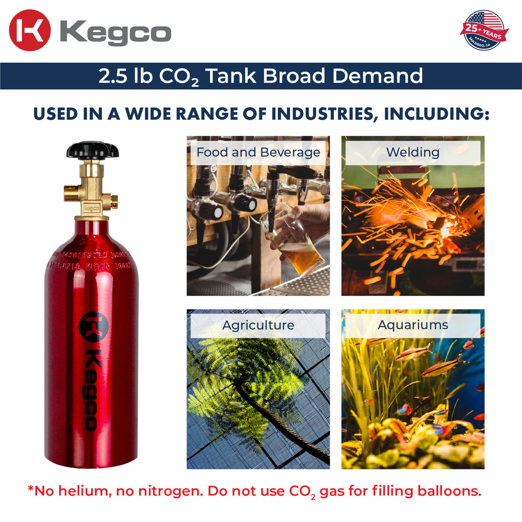 Once filled, this tank should be able to dispense 3-4 full size beer kegs. CO2 tanks are used in a wide range of industries due to their versatility including food and beverage, welding, agriculture and aquariums. Do not use CO2 gas for filling balloons.