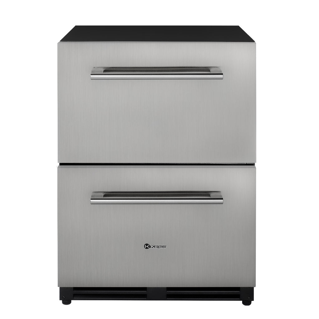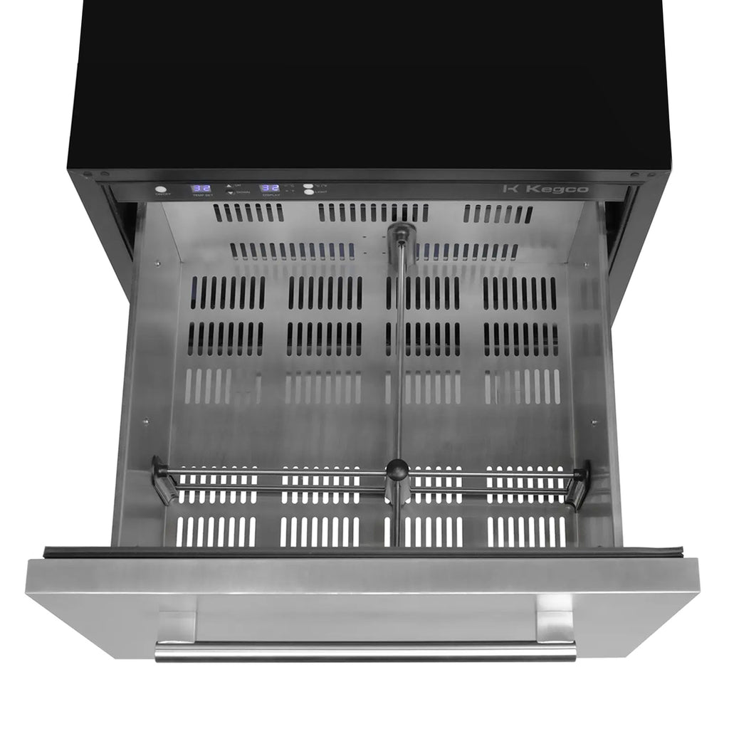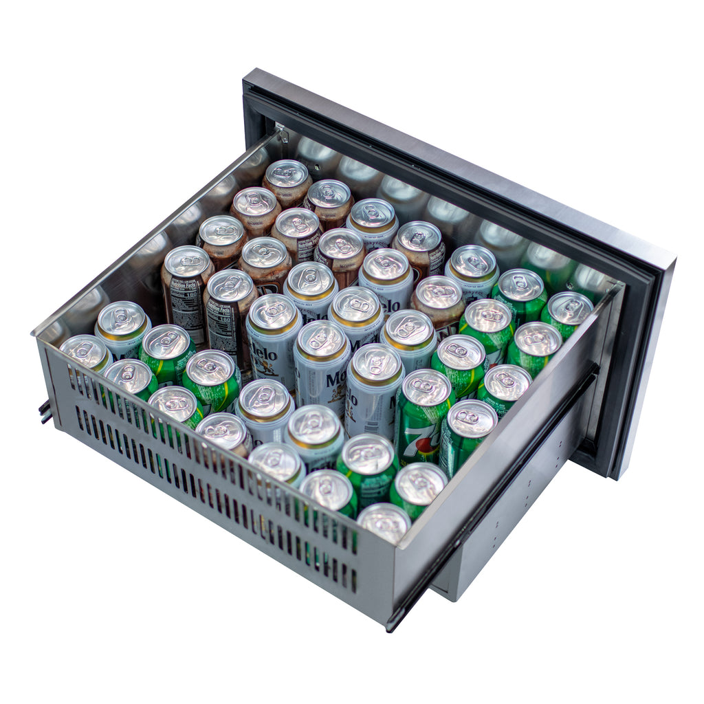 Two drawers | Top drawer can hold up to 84 cans or 40 bottles. Bottom drawer can hold up to 70 cans or 56 bottles. Capacity is based on standard 12oz. cans or 22oz. beer bottles at 11" tall.