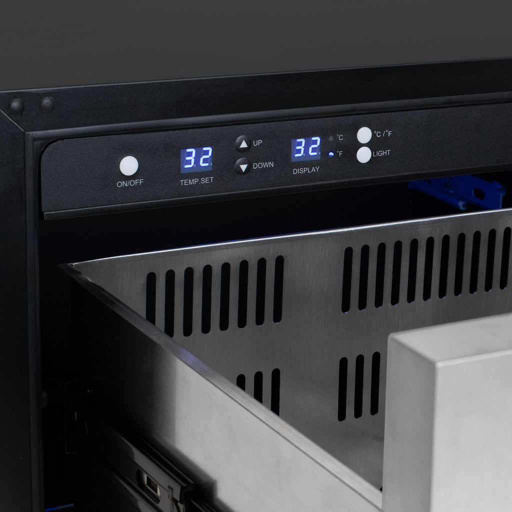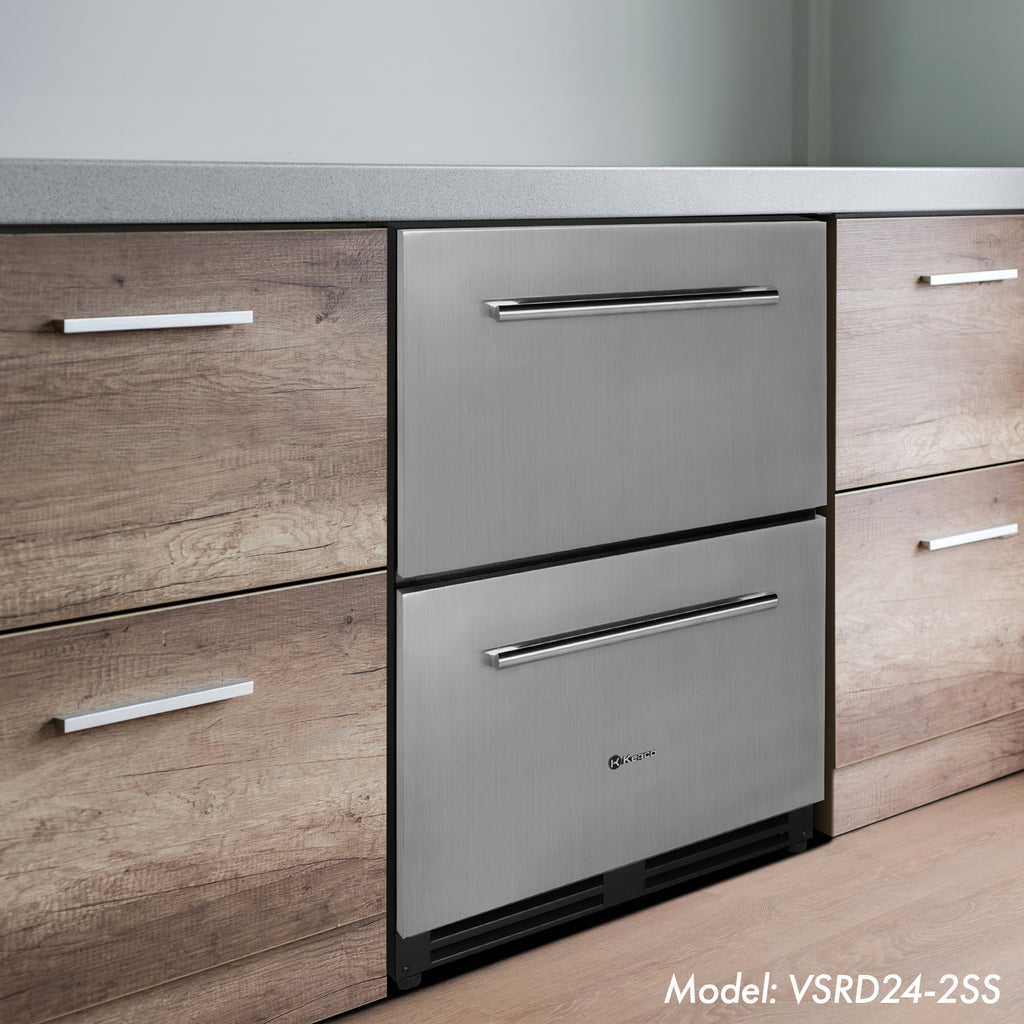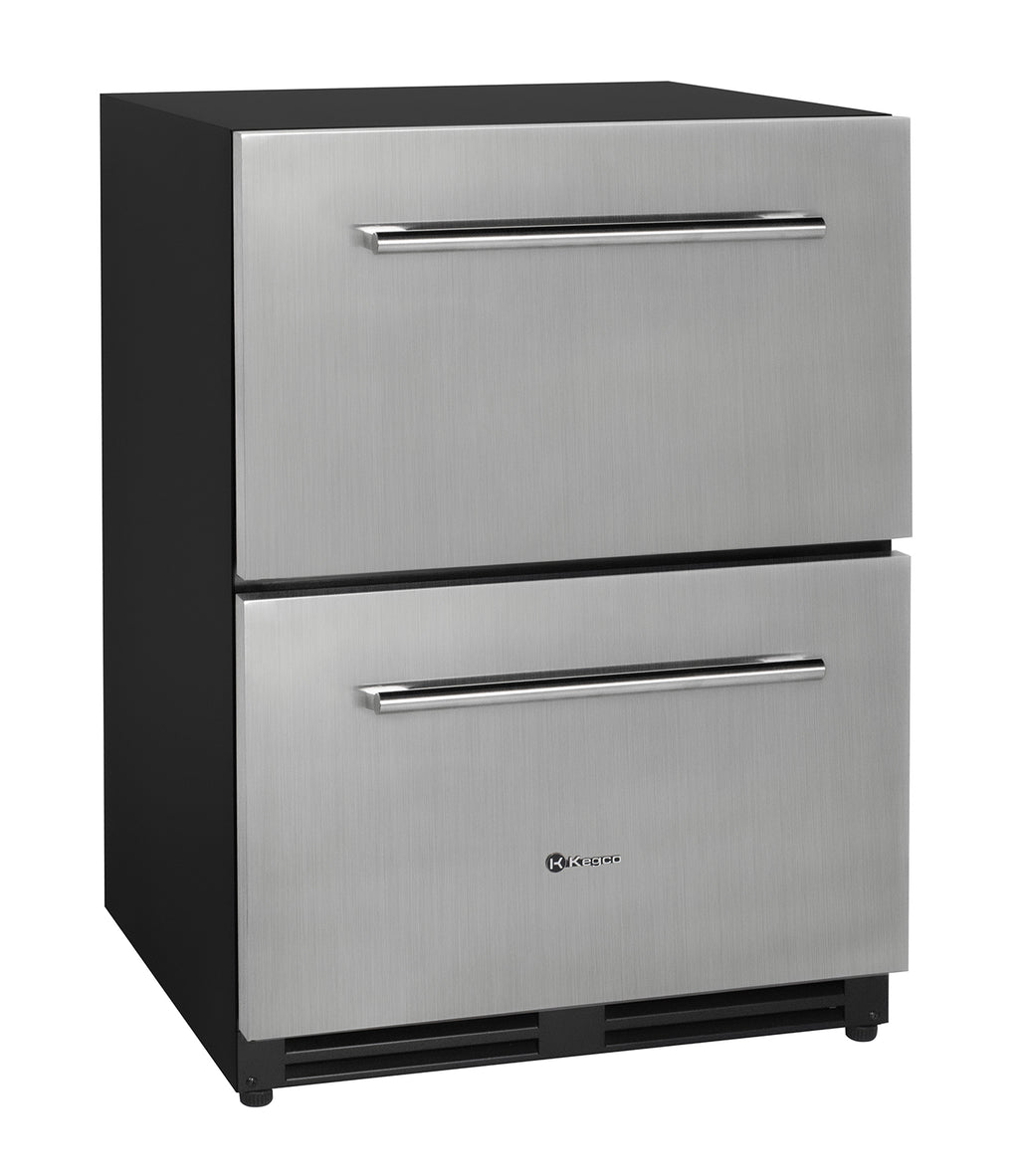 Two drawers | Top drawer can hold up to 84 cans or 40 bottles. Bottom drawer can hold up to 70 cans or 56 bottles. Capacity is based on standard 12oz. cans or 22oz. beer bottles at 11" tall.