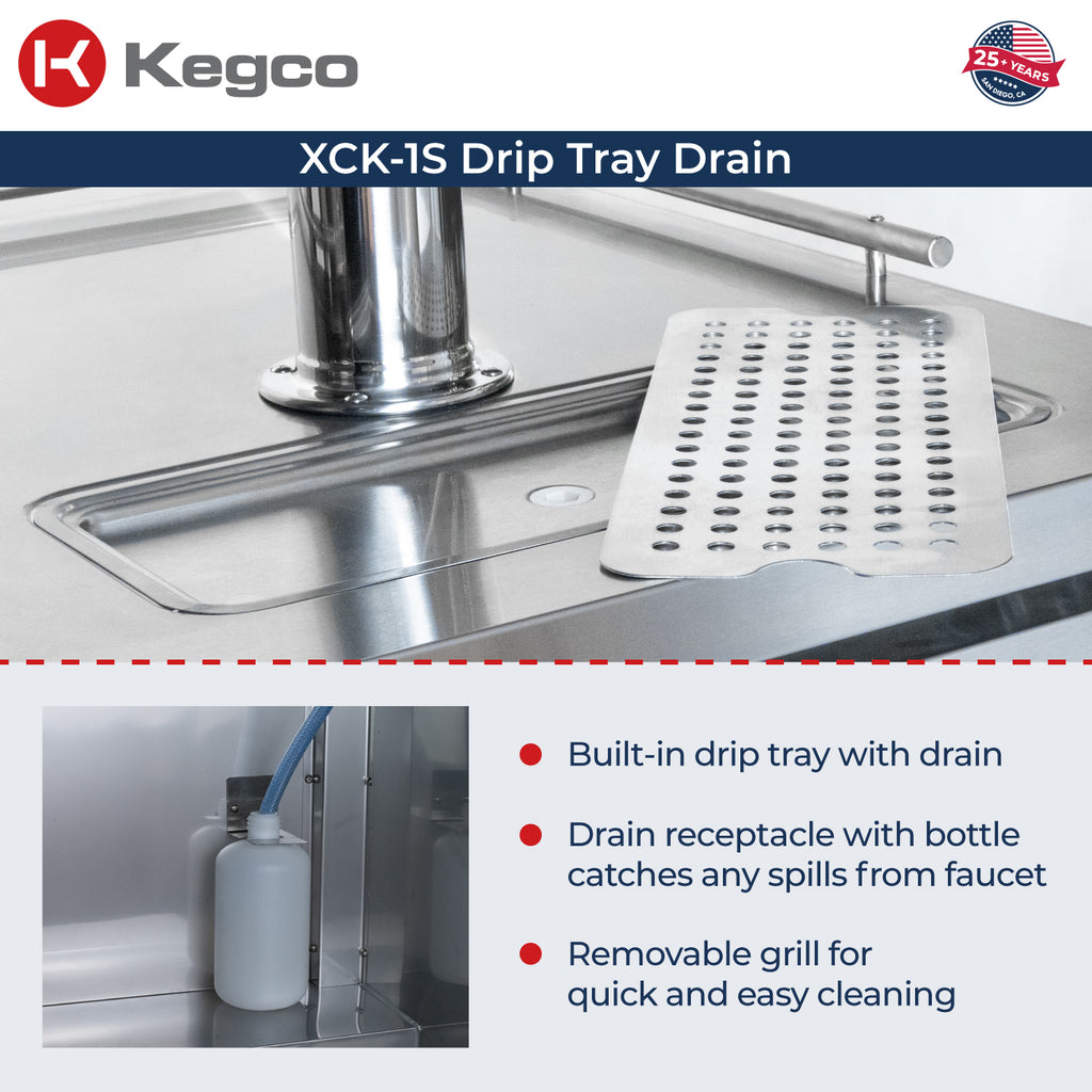 Any spills from the faucet are directed into a spill bottle that can be easily removed and emptied out. The 15" x 6" built-in drip tray is wide enough to catch any spills on top of the kegerator surface. It comes with a stainless steel screen cover that can be removed for quick and easy cleaning.