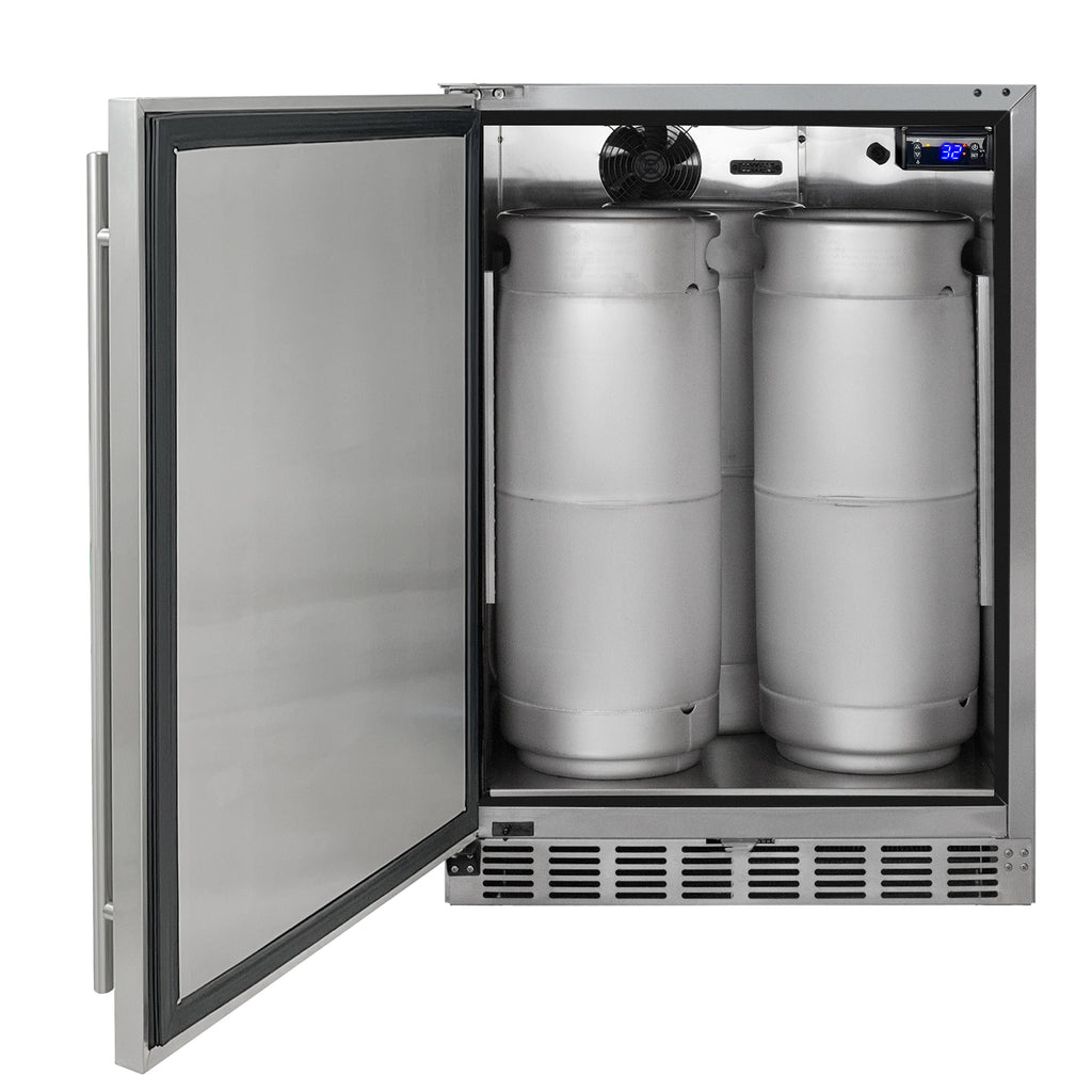 The beautiful stainless steel interior is more durable than the plastic liner found in many competing models and easy to clean. Enough floor space is provided to house a full size keg, two quarter slim kegs or up to three 5 gallon kegs for a variety of configurations. PLEASE NOTE: Will not hold 50L European kegs.