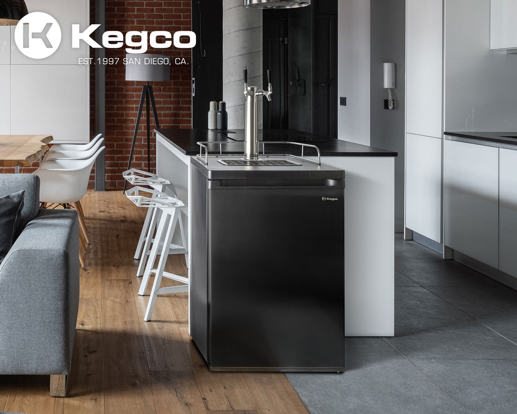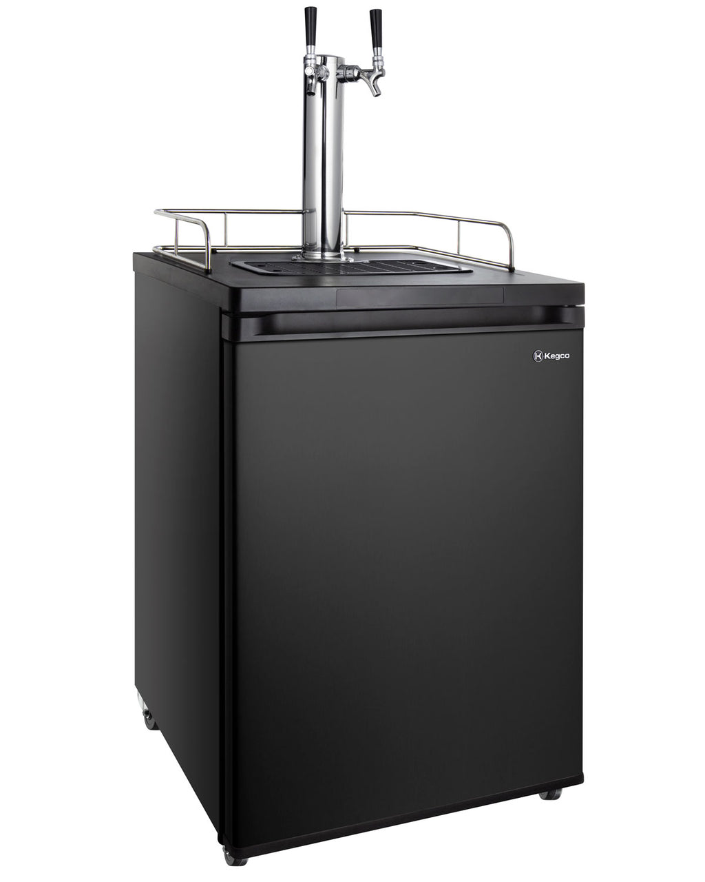 Kegco's K209B-2NK Two Tap Keg Beer Dispenser is a high-quality beer refrigerator that stores your kegs in a sleek all-black cabinet with a dual faucet draft beer tower. It has a large interior that can easily accommodate one full size, pony, or quarter slim keg, two 5 gallon commercial kegs along with one 5 gallon home-brew keg, or up to three 5 gallon home-brew kegs, and the stainless steel interior floor mat provides extra durability by displacing the weight of your kegs evenly over the floor of the cabinet. Comes with a Kegco Exclusive tower that measures 14" tall, giving you an extra 2" of space over standard draft beer towers to allow you to easily fill tall growlers and pint glasses. When you aren't using this keg refrigerator to dispense beer, the two included adjustable wire shelves allow you to convert the unit into a regular all-refrigerator or beverage center to provide additional refrigerated storage space. Comes with a Kegco Exclusive tower that measures 14" tall, giving you an extra 2" of space over standard draft beer towers to allow you to easily fill tall growlers and pint glasses.