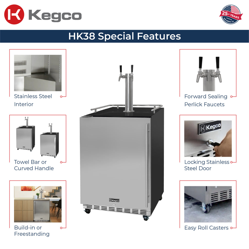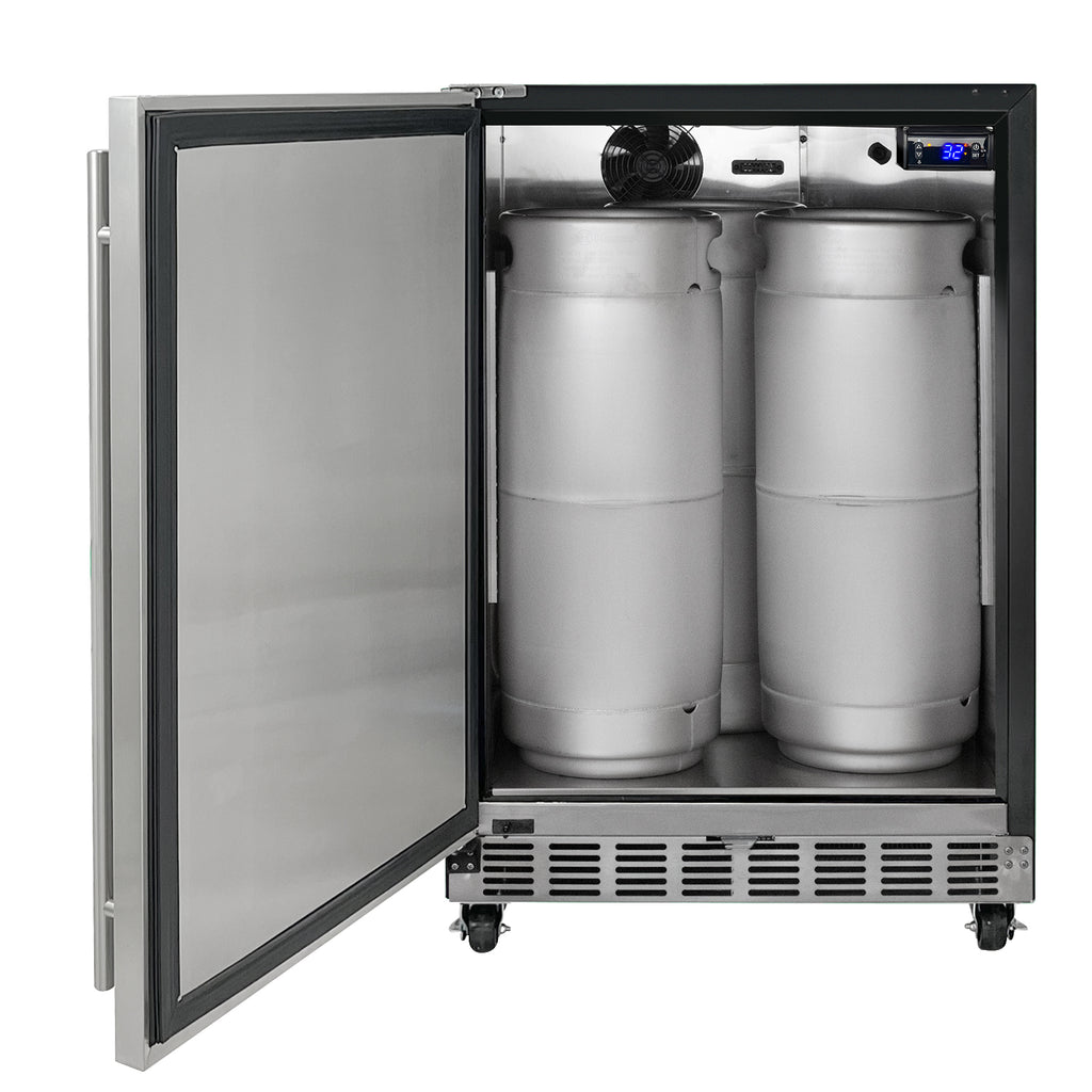 The beautiful stainless steel interior is more durable than the plastic liner found in many competing models and easy to clean. Enough floor space is provided to house a full size keg, two quarter slim kegs or up to three 5 gallon kegs for a variety of configurations. PLEASE NOTE: Will not hold 50L European kegs.