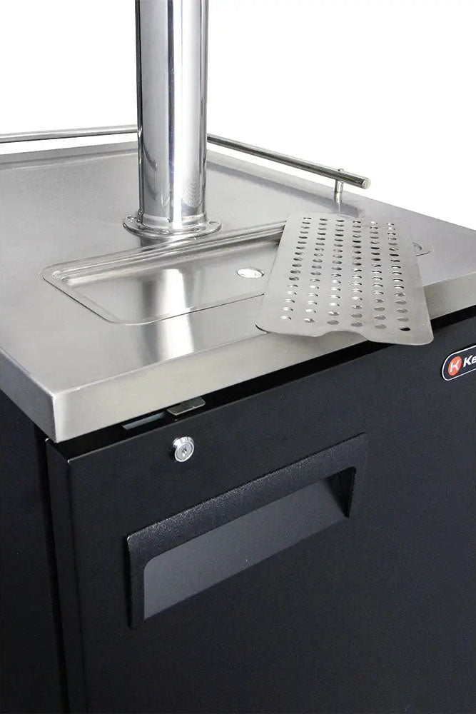 4" locking casters provide mobility and a knockout allows you to mount the CO2 tank outside the cabinet for quick and easy monitoring. The steel walls and diamond plate floor are designed to withstand frequent keg changes and it's powerful compressor with top-notch insulation will keep your keg cold to the last drop. A sturdy stainless steel top features a guard rail to prevent glasses from sliding off and also has a bulit-in drip tray with a drain that runs to an internal drain receptacle for easy cleanup.