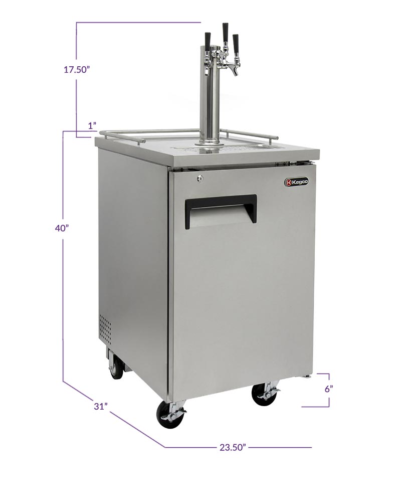The stainless steel kegerator cabinet features 4" locking casters for mobility, steel walls with a diamond plate floor to withstand frequent keg changes, a stainless steel top with a built-in drip tray, fan forced cooling with a blower that directs cool air into the tower and a knockout that allows you to mount the CO2 tank outside the unit. A 1/7 hp compressor and foamed in place polyurethane insulation cool your keg and keep it cold until the last drop.