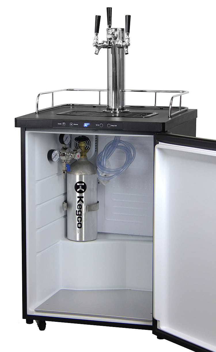 The KOM30X-3 is designed for home use, so it is quiet and energy efficient. The attractive chrome safety rail helps to keep mugs and glasses from sliding off and installs with ease. The removable recessed drip tray with a plastic grill can easily be taken out and cleaned in the dishwasher. This Kombucha Cooler includes a triple faucet draft tower with stainless steel faucets and fittings to ensure a sanitary environment for the live cultures found in kombucha. Also included are three sets of ball lock keg couplers for cornelius home brew kegs, a single gauge CO2 regulator, a 3-way air distributor and a 5 lb Aluminum CO2 tank. One 5 lb tank can pressurize up to fourteen 5-gallon kegs before needing to be refilled.