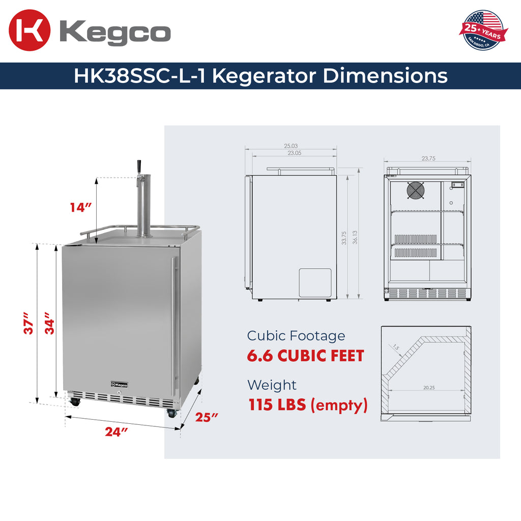 • Kegco HK38SSC-L-1 Left Hinge Keg Dispenser features a durable stainless steel exterior that allows it to be built-in undercounter to provide a seamless look in outdoor commercial applications