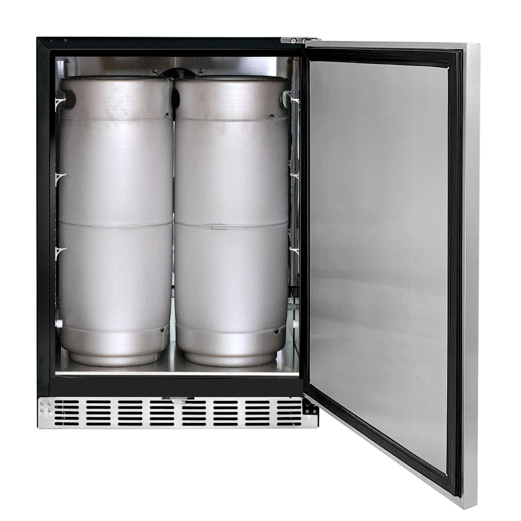 The beautiful stainless steel interior is more durable than the plastic liner found in many competing models and is easy to clean. The keg cooler has enough floor space to house one quarter slim keg or two five gallon commercial kegs.