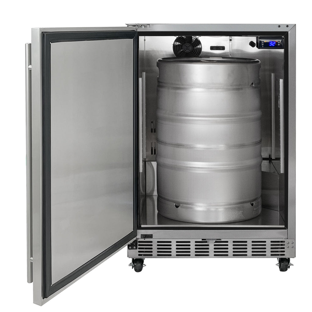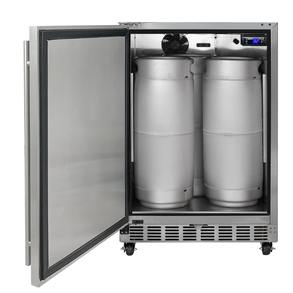The beautiful stainless steel interior is more durable than the plastic liner found in many competing models and easy to clean. Enough floor space is provided to house a full size keg, two quarter slim kegs or up to three 5 gallon kegs for a variety of configurations. PLEASE NOTE: Will not hold 50L European kegs.