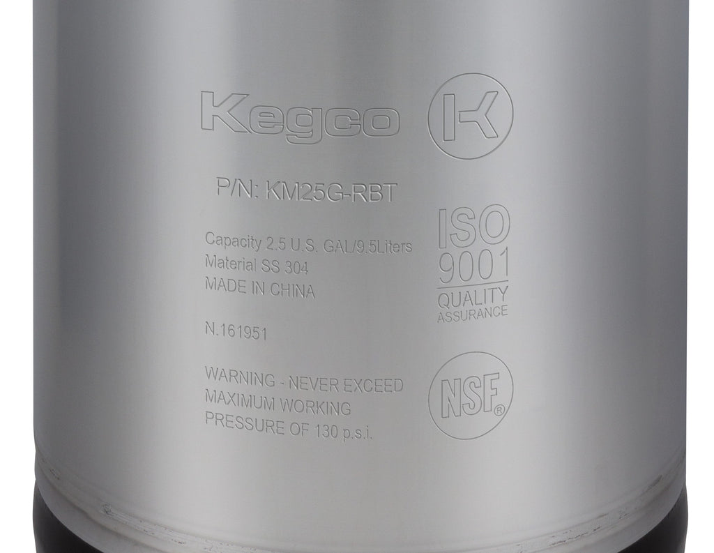 Kegco's KM25G-RBT Home Brew Beer Keg has a convenient 2.5 gallon size that is perfect for taking your favorite beverages on the road or providing samples in small batch sizes. This homebrew keg, also known as a Pepsi keg or a Cornelius keg, is designed for use with ball lock keg couplers and has easily accessible ball lock fittings for fast cleaning and maintenance. Constructed of 304 grade stainless steel, the keg features a permanently molded rubber bottom skirt and top handle that make it simple to carry and stack. The stainless lid fastens tightly to the body and has a pressure release valve that allows you to easily depressurize the keg. Kegco homebrew beer kegs can be used to store many of your favorite beverages, including beer, soda, wine, kombucha, and cold-brew coffee.