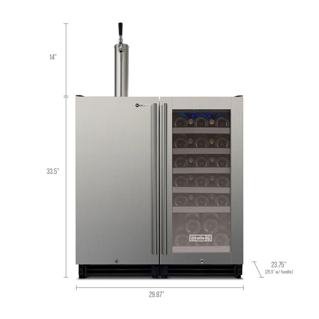 The VS15-1WK-L Built-In Undercounter Side-by-Side Single Zone Wine Cooler and Single Faucet Keg Dispenser is the ultimate beverage center to upgrade your home bar or kitchen. This sleek and sophisticated kegerator and wine refrigerator combination lets you have the best of both worlds. Cold beer on tap and perfectly chilled wine is within arms reach with this beverage center that can hold up to 7 gallons of draft beer and up to 30 bottles of wine. This unit is perfect for daily use and entertaining, providing you with a variety of beverage options. The unit is designed with a French door swing to easily access both the keg and wine bottles simultaneously. Digital temperature display for both sides allows you to easily maintain and control the temperature of your beverages. Manufactured by the industry leaders in the beverage industry, Kegco and Allavino, these units include only premium parts with all stainless steel contact and all parts are serviceable.