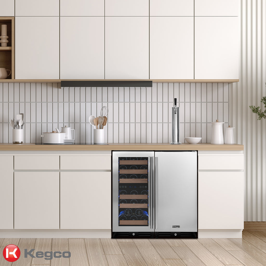 The VS15-2WK Built-In Side-by-Side Wine Cooler and Single Faucet Keg Dispenser is the ultimate beverage center to upgrade your home bar or kitchen. This sleek and sophisticated kegerator and wine refrigerator combination lets you have the best of both worlds. Cold beer on tap and perfectly chilled wine is within arms reach with this beverage center that can hold a 7.75 gallon draft beer keg and up to 30 bottles of wine. This unit is perfect for daily use and entertaining, providing you with a variety of beverage options. The unit is designed with a French door swing to easily access both the keg and wine bottles simultaneously. Digital temperature display for both sides allows you to easily maintain and control the temperature of your beverages. Manufactured by the industry leaders in the beverage industry, Kegco and Allavino, these units include only premium parts with all stainless steel contact and all parts are serviceable.