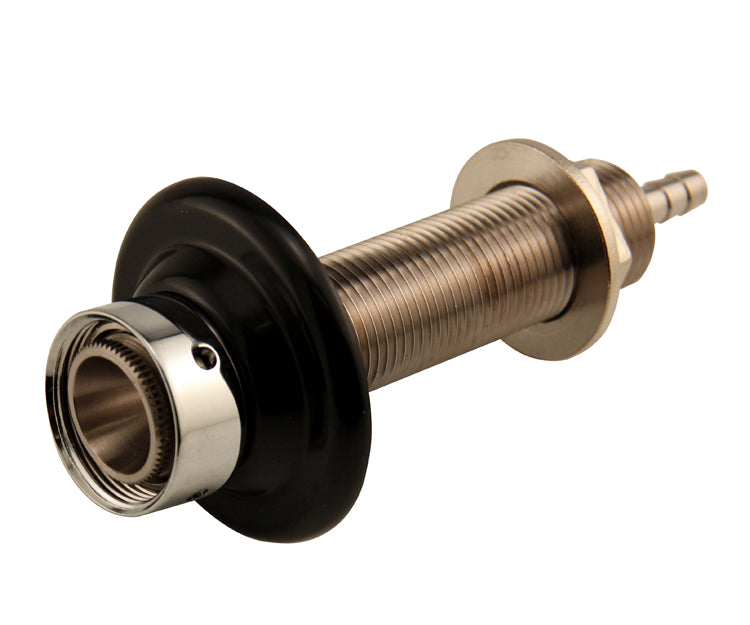 The Kegco SHANK4-ASC 4-1/8" Nipple Shank is has a 3/16" hose nipple to attach a beer line to a faucet and can be mounted through a 1" hole in a wall, refrigerator door, or cabinet. This nipple shank is constructed of stainless steel with a strongly bonded oxide layer that makes it it less susceptible to attacks by acids making it ideal for wine and cider in addition to dispensing beer. The shank includes a forged brass lock nut, a black plastic flange, and is 3.5" long measured from the end of the threading to the end where the faucet attaches. This nipple shank includes a flange on the front, a compression ring on the back and comes fitted with a tail piece for a beer line connection. The included compression ring secures the shank to the mounting surface. A faucet is not included with the shank.