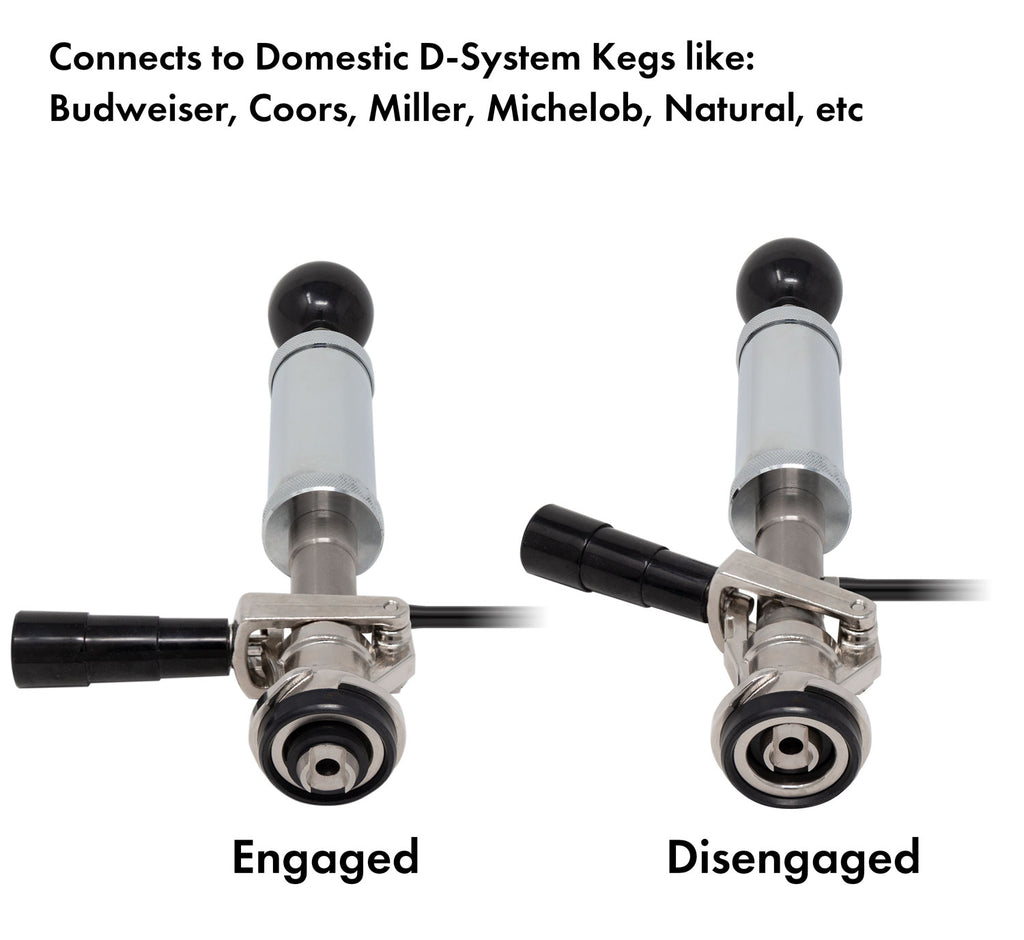 The Kegco American D System Keg Party Pump is our most popular keg beer tap. The metal keg pump is rendered in tin-nickle plate making it built for long lasting performance and durability. American D System keg pump features a forged brass base, a chrome plated air pump, a squeeze trigger, and lever handle. The lever handle to makes it the perfect accessory for 1/6 size kegs and the short stroke pump ensures quick pumping. These keg pumps are compatible with most domestic Brand Kegs such as Budweiser, Miller, Coors, and Busch. The Kegco D system keg pump is made to provide long-lasting service and outperform any other keg pump on the market.