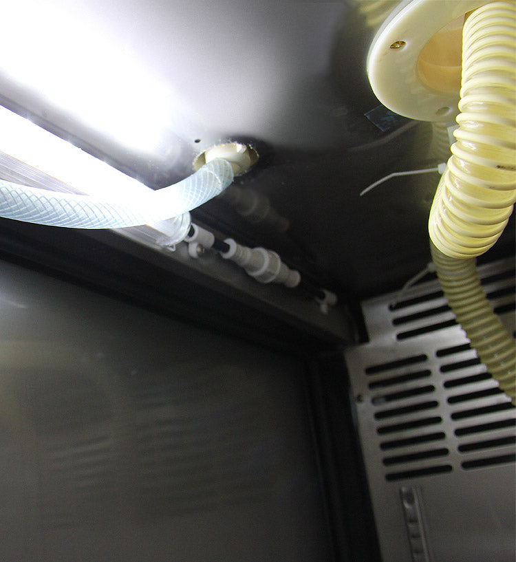 Designed with a sturdy steel construction and a smooth black exterior finish with an attractive stainless steel top, the XCK-2448B has been ruggedly built to look great while withstanding the rigors of commercial use. Inside, the interior walls and ceiling have been made of stainless steel, and a rubber floor mat reduces the shock on the stainless steel floor caused by heavy kegs. This beer keg refrigerator is suitable for freestanding or built-in use, and has been specially designed for ultimate convenience. The cooling system can be quickly accessed from the front of the cabinet for easy servicing, and an internal light can be used to illuminate the interior, allowing you to effortlessly make adjustments to your dispense system. The hoses inside of the cabinet that direct cool air into the draft arm and drain beer from the drip tray to the external drain have been neatly tucked out of the way.