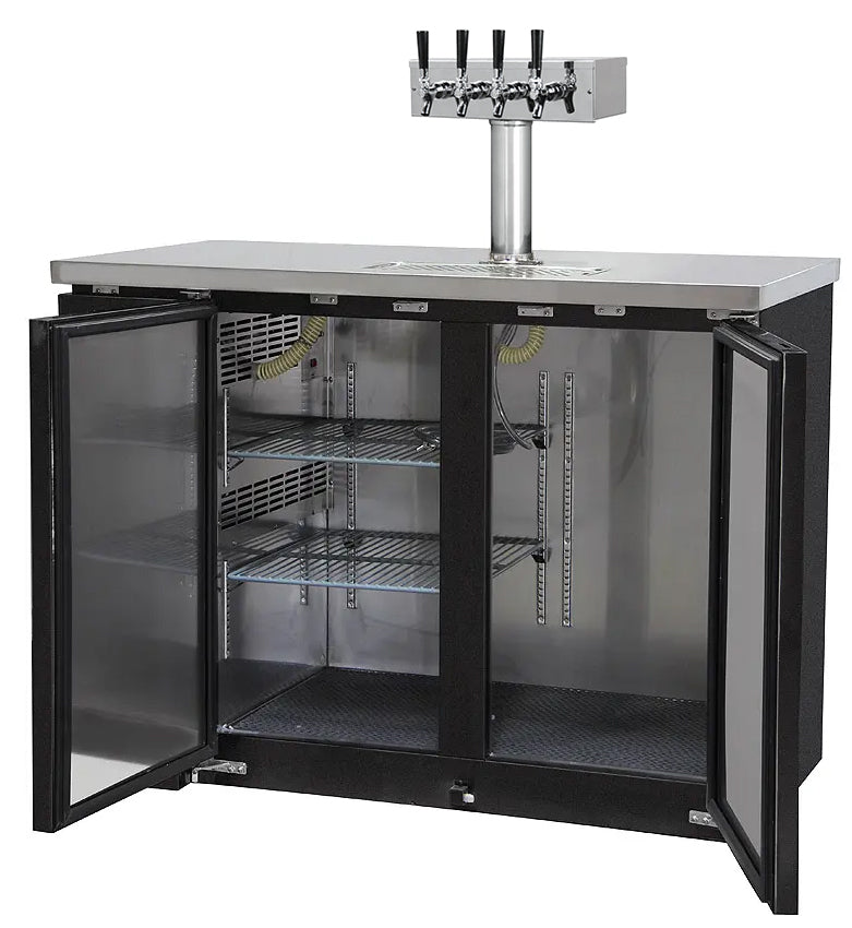 This Kegco Commercial Kegerator has an 4 faucet dispense system that makes it ideal for serving a variety of craft beers from your favorite microbreweries. This beer dispenser has enough interior space to house two full-size kegs or a combination of smaller kegs. Forced air refrigeration keeps the beer in the kegs ice cold and and hoses direct cold air into each beer tower to ensure the line is cooled all the way to the faucet. This beer dispenser includes two heavy duty adjustable shelves, providing the ultimate in versatility. You can store cans and bottles or keep mugs frosty on one side while dispensing multiple 5 gallon kegs from the other side! Built-in drip trays catch any drops after you fill a glass and route to an external drain, making daily maintenance a breeze.
