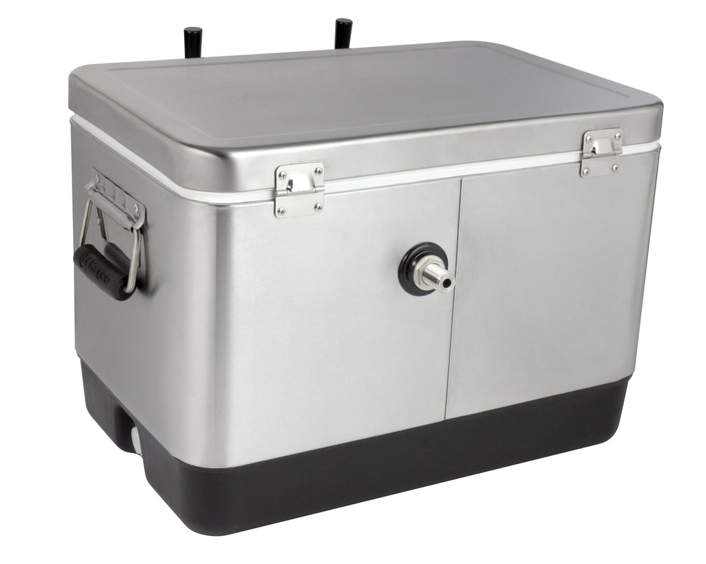This Kegco Jockey Box makes it easy to enjoy ice cold beer straight from the keg at your next outdoor party, tailgate, or camping trip - without needing to keep the kegs themselves cold! Your beer is pumped into the jockey box and through a stainless steel coil that has been submerged in ice water, cooling down your beer as it passes through the coils. These stainless coils make this jockey box far superior for cooling than "cold plate" style jockey boxes.This double faucet jockey box features two 3/8" O.D. 120' stainless steel coils, allowing you to dispense from up to two kegs at the same time. It also comes with two chrome-plated brass faucets with brass levers, two black plastic faucet knobs, stainless steel shanks, and ice box coupler assemblies. The faucets are mounted in the center of the cooler, making it easy to install a drip tray beneath them to minimize the mess caused by drips and spills.This jockey box is made from a durable 52-quart chest cooler with Ultratherm foam insulation, which provides superior cold retention. The cooler measures 14.38" H x 25.38" W x 14.38" D, and features reinforced swing-up handles with a tie down loop feature.