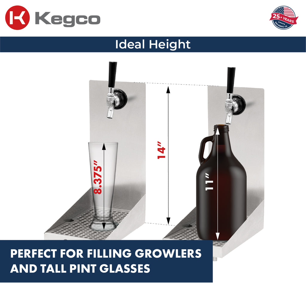 This high-quality stainless steel drip tray boasts a sleek design with a 14" backsplash, perfectly sized to fit a growler or pint glass under the faucet for easy pouring and minimal mess.