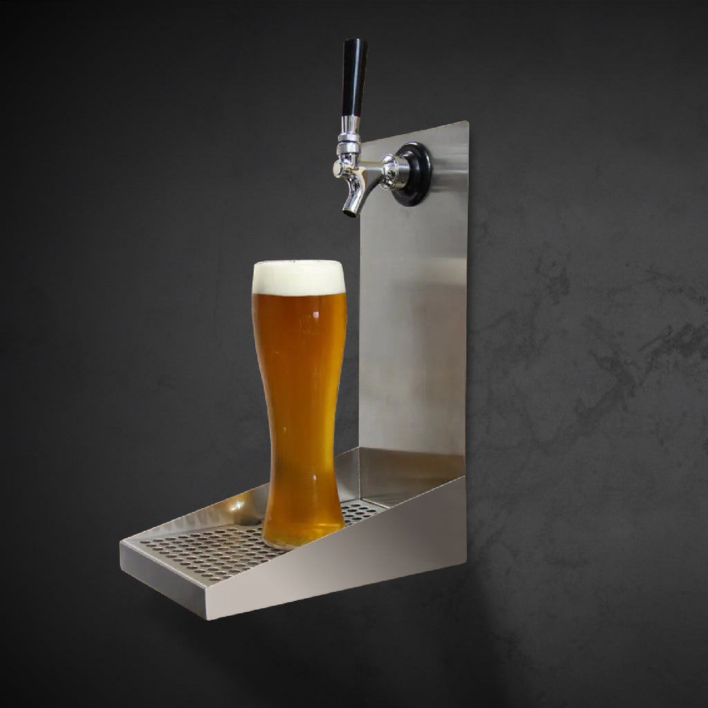This high-quality stainless steel drip tray boasts a sleek design with a 14" backsplash, perfectly sized to fit a growler or pint glass under the faucet for easy pouring and minimal mess.