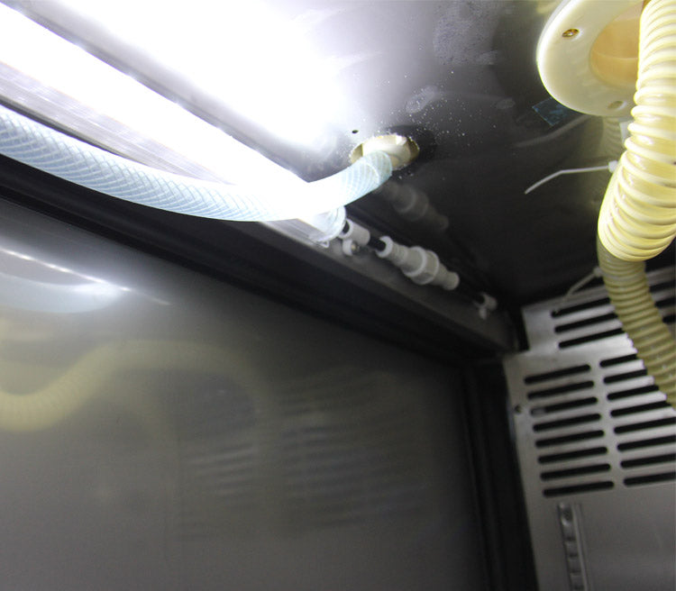 The durably built XCK-2460B-8K is designed to withstand the demands of commercial use. Featuring sturdy steel construction with a smooth black exterior finish and an attractive stainless steel top, stainless steel interior walls and ceiling and a rubber floor mat that reduces the shock of the heavy kegs on the stainless steel floor, it is sure to provide reliable performance for years. Internal lighting conveniently illuminates the cabinet to make adjustments to your dispense system effortless. The hoses inside the cabinet that direct cool air into the draft arm and drain beer from the drip tray to an external drain are efficiently tucked out of the way. The cooling unit is serviceable from the front of the kegerator, allowing the kegerator to be used in both freestanding and built-in applications.