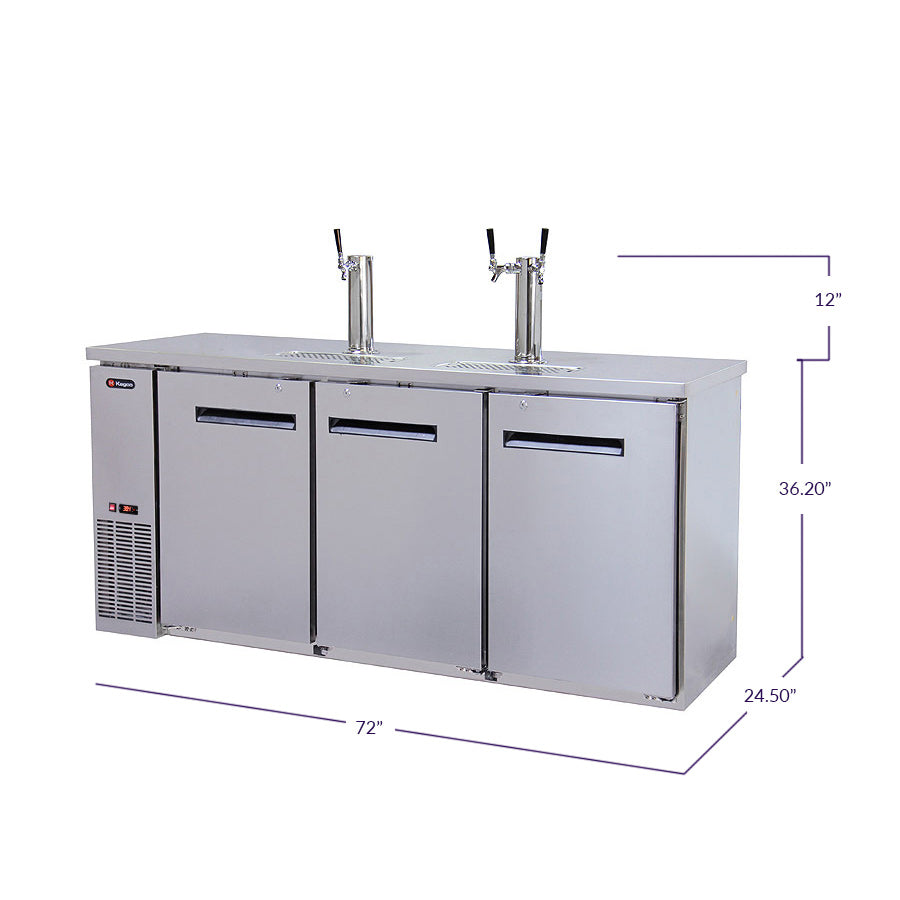 The durably built XCK-2472S-6K is designed to withstand the demands of commercial use. Featuring sturdy steel construction with an attractive stainless steel exterior, stainless steel interior walls and ceiling and a rubber floor mat that reduces the shock of the heavy kegs on the stainless steel floor, it is sure to provide reliable performance for years. Internal lighting conveniently illuminates the cabinet to make adjustments to your dispense system effortless. The hoses inside the cabinet that direct cool air into the draft arm and drain beer from the drip tray to an external drain are efficiently tucked out of the way. The cooling unit is serviceable from the front of the kegerator, allowing the kegerator to be used in both freestanding and built-in applications.