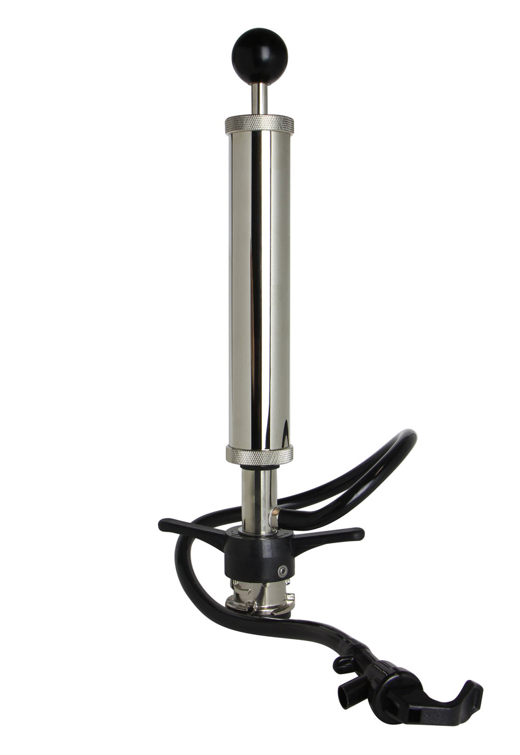 - D System keg pump features a forged brass body with a chrome finish, a hose barb outlet, an attached plastic faucet, 2' of beer line, and an o-ring designed piston that ensures maximum pumping efficiency and reliability