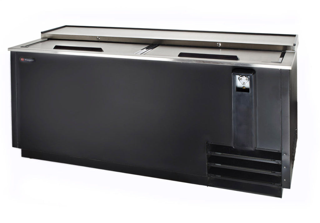 The Kegco XCD-2650B Deep Well Bottle Cooler is the perfect for commercial environments and is an ideal way to keep plenty of frosty drinks at arm's reach. This deep well refrigerator has a rugged 18 Cu. Ft. black cabinet and features two brushed stainless steel lids with locks and a convenient bottle opener with built-in cap catcher mounted on the front of the unit. The bottle opener allows you to quickly serve customers while keeping messes to a minimum. The interior of the cooler is constructed of aluminum and comes equipped with 3 plastic coated steel dividers to keep your inventory organized. Bottle chiller has 18 Cu. Ft. of storage space that is capable of storing and cooling up to 396 12 oz. bottles or up to 576 12 oz. cans at one time. The Deep Well Bottle Chiller boasts a 1/3 hp compressor with fan-forced cooling for even temperatures throughout the cabinet, and foamed in place polyurethane insulation helps to maintain interior temperatures between 32 and 41° F.