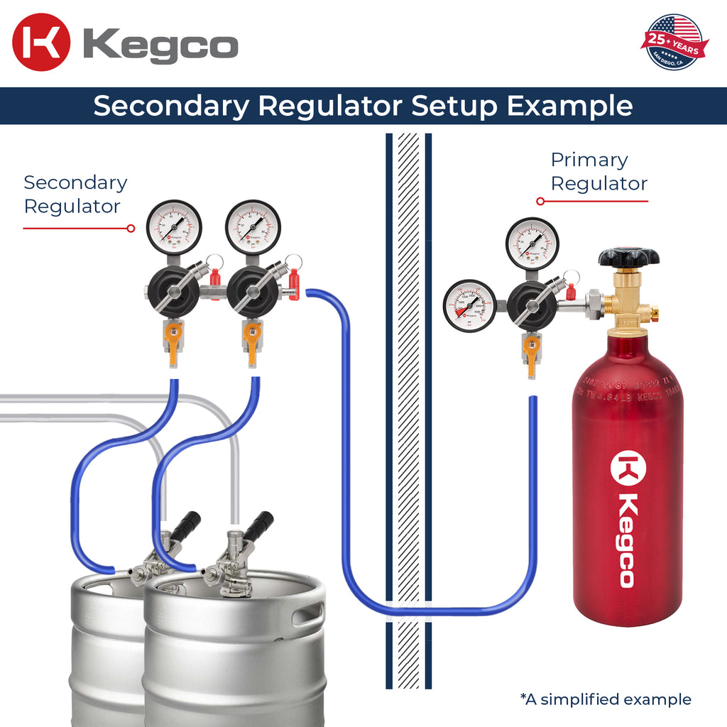 Kegco durable construction guarantees consistent flow with every pour. The T-style adjustment valve allows for precise pressure control, even when the regulator is cold. Two individual gauges display the CO2 pressure inside the kegs, while the pressure release valve is conveniently located for easy access. For optimal performance, this secondary regulator requires a primary regulator with one output, connected via an air line.