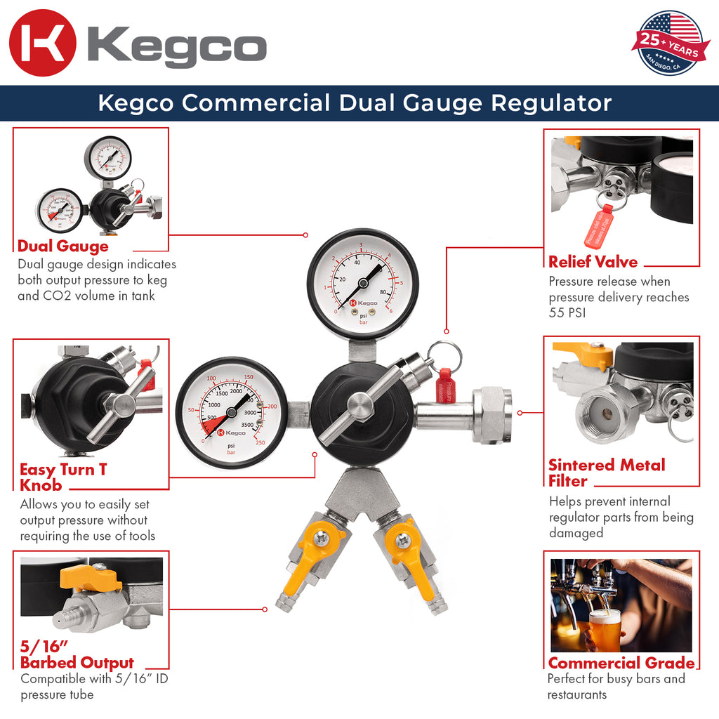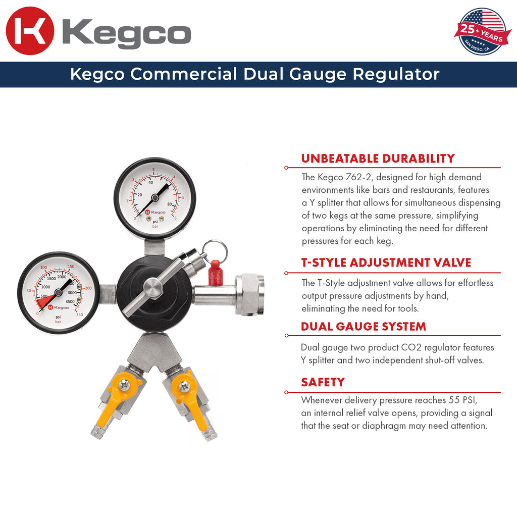 - The Kegco 762 Dual Gauge Two Products Commercial Regulator has been durably constructed for a consistent flow pour after pour in demanding commercial environments like bars and restaurants.