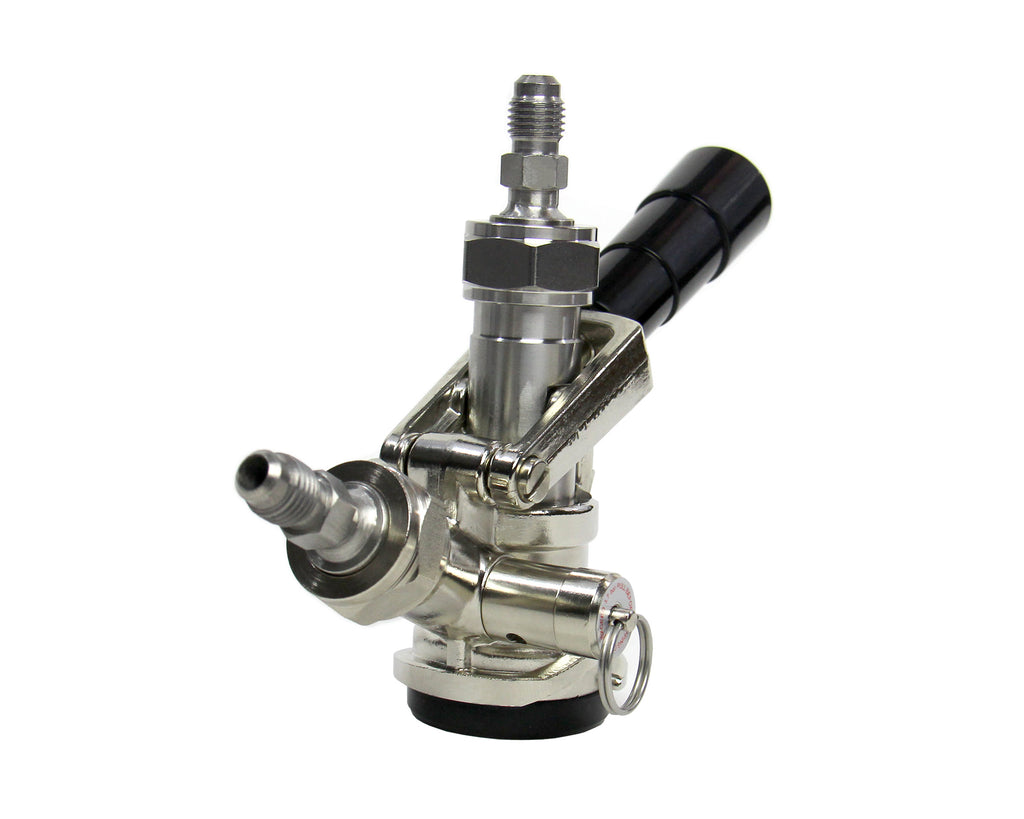 The Kegco KT85-MFL Lever Handle D System Keg Tap is the perfect coupler for anyone who wants to easily switch back and forth from domestic to home brew kegs. This keg tap is constructed of a nickel-plated forged brass body and features a stainless steel probe and a black lever handle. Coupler comes equipped with 1/4" MFL fittings for both the gas in and liquid out posts. With these convenient fittings you no longer have to worry about pulling a hose off of a hose nipple or removing clamps if you want to use a different kind of coupler. This D system keg coupler is easy to use - simply unscrew the nut from the fitting and screw it onto comparable ball lock or pin lock couplers.