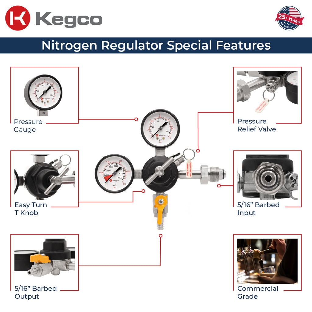 - Clear Pressure & Gas Monitoring. Dual gauges clearly display both output pressure to the keg and Nitrogen volume remaining in the tank.