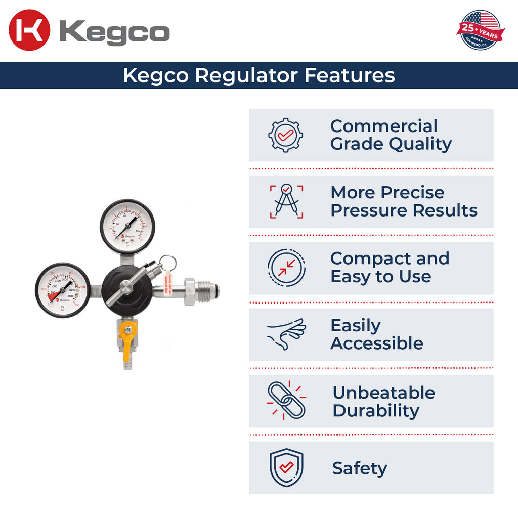 Kegco's 762-N Dual Gauge Commercial Grade Nitrogen Regulator is engineered to provide exceptional, peak performance in even the most demanding commercial environments. Built with durability in mind, this regulator ensures a consistent flow with every pour, whether it's stout beer, nitro cold brew coffee, or wine. Featuring a user-friendly T-Style adjustment valve, you can easily set the keg pressure, even when the regulator is cold. The top gauge displays the internal pressure of the keg, while the side gauge monitors the gas volume in the cylinder. A conveniently located pressure release valve provides added safety and ease of use.