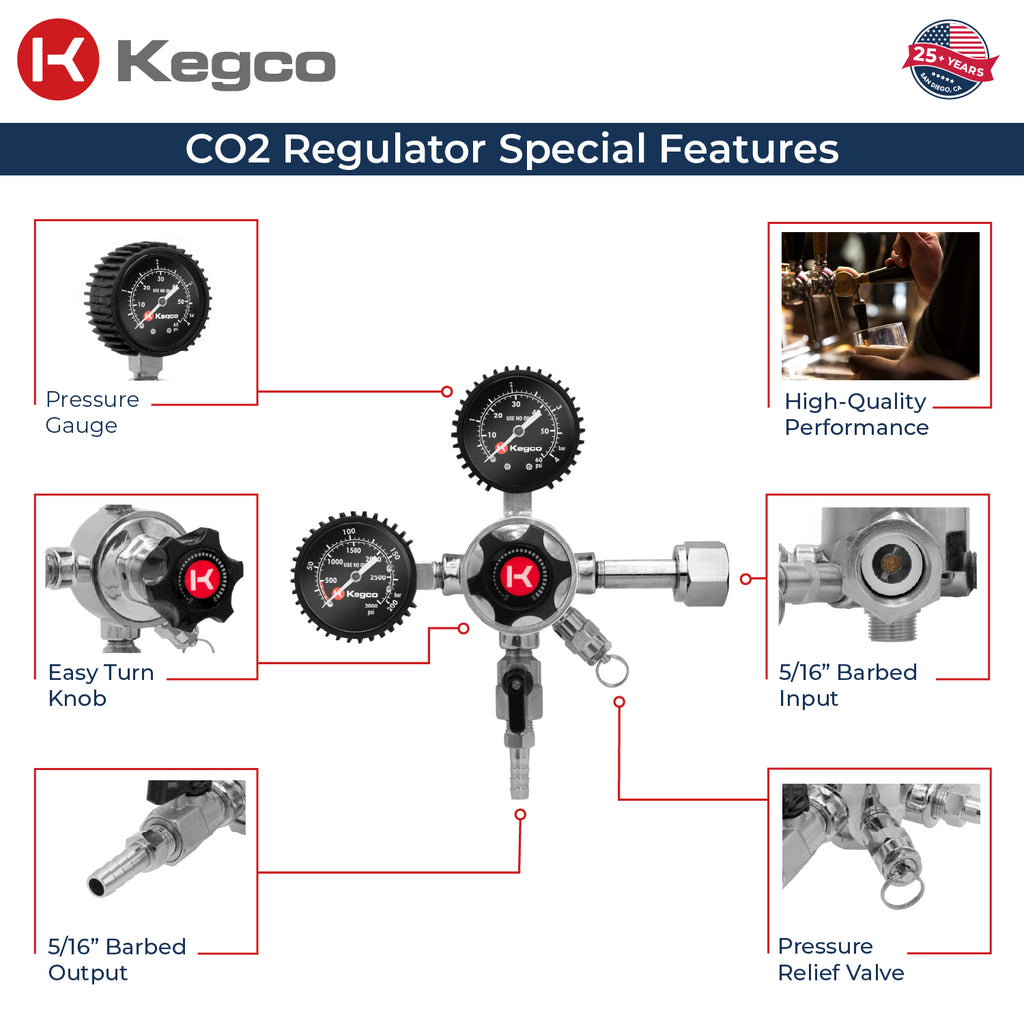 The LHU52 Elite Series Dual Gauge CO2 Draft Beer Regulator has a bold design with elite functionality. Designed for applications where one keg of beer will be dispensed at a time, it boasts a double gauge design that displays both the CO2 pressure inside of the keg and the volume of CO2 gas remaining in the cylinder, so you'll never be caught off guard by an empty gas tank again. This regulator features a single 5/16" barb and a large adjustment knob that is easy to grip and turn for precise pressure placement. For added safety, it also has a manual pressure release valve and an internal pressure relief valve that releases pressure at 55-65 PSI. A sintered metal filter has been built into the stem to keep harmful contaminants out of the regulator, ensuring long-lasting, high-quality performance.