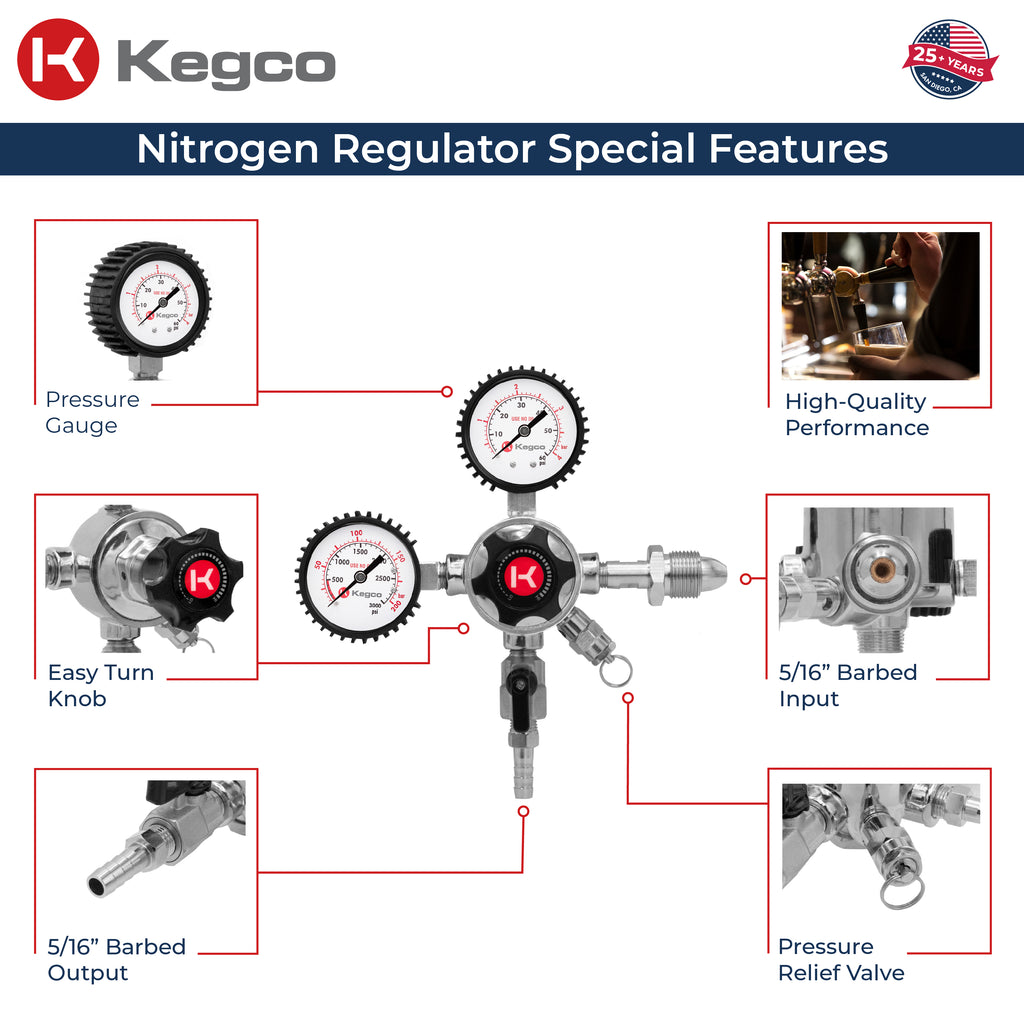 Kegco's LHU5N Elite Series Dual Gauge Nitrogen Draft Beer Regulator has a bold design with elite functionality. Designed for applications where one keg of stout beer, coffee, or wine will be dispensed at a time, it boasts a double gauge design that displays both the pressure inside of the keg and the volume of gas remaining in the cylinder, so you'll never be caught off guard by an empty tank again. This regulator features a single 5/16" barb and a large adjustment knob that is easy to grip and turn for precise pressure placement. For added safety, it also has a manual pressure release valve and an internal pressure relief valve that releases pressure at 55-65 PSI. A sintered metal filter has been built into the stem to keep harmful contaminants out of the regulator, ensuring long-lasting, high-quality performance. This nitrogen regulator is compatible with high pressure tanks with CGA-580 valves.