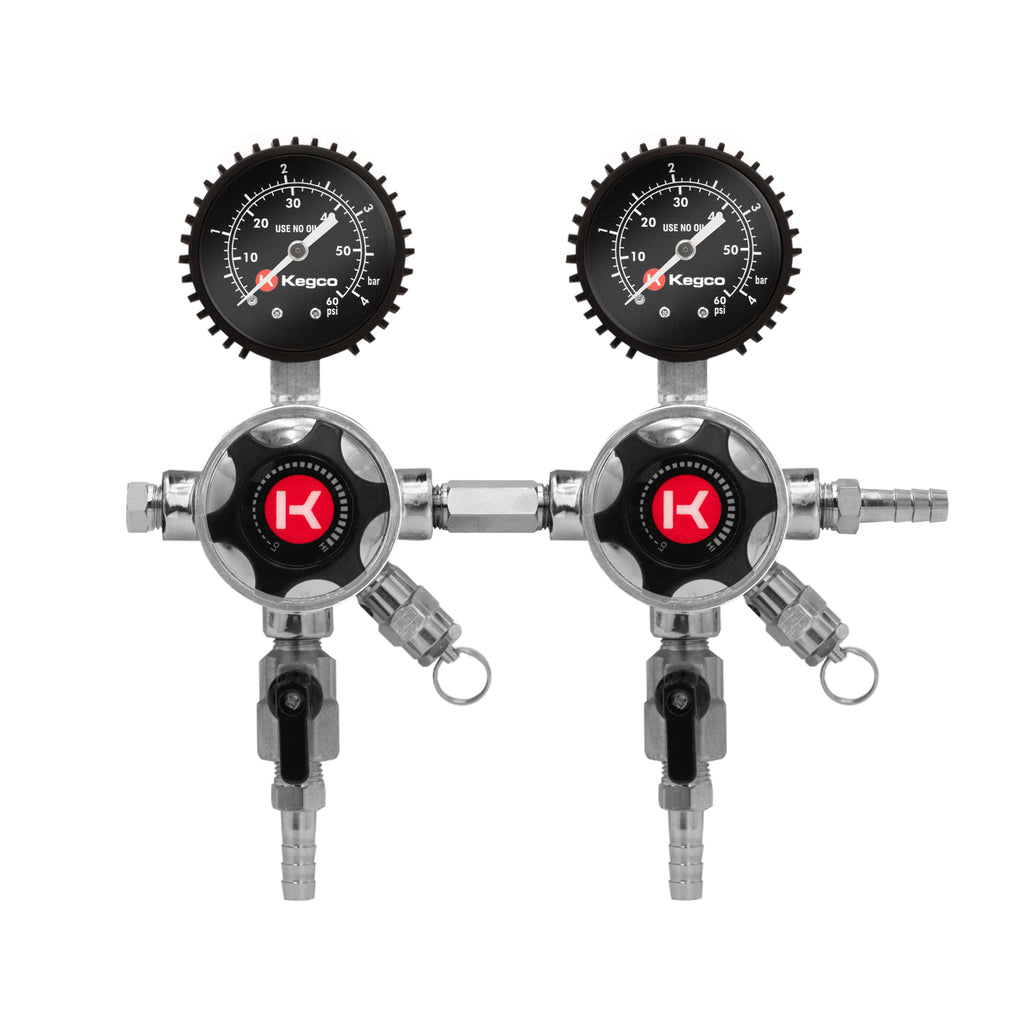 This regulator's sophisticated design boasts two bold black gauges with high-contrast red and white text that is both stylish and easy to read. Two matching black plastic handles and black shut-off knobs add to the sleek look.