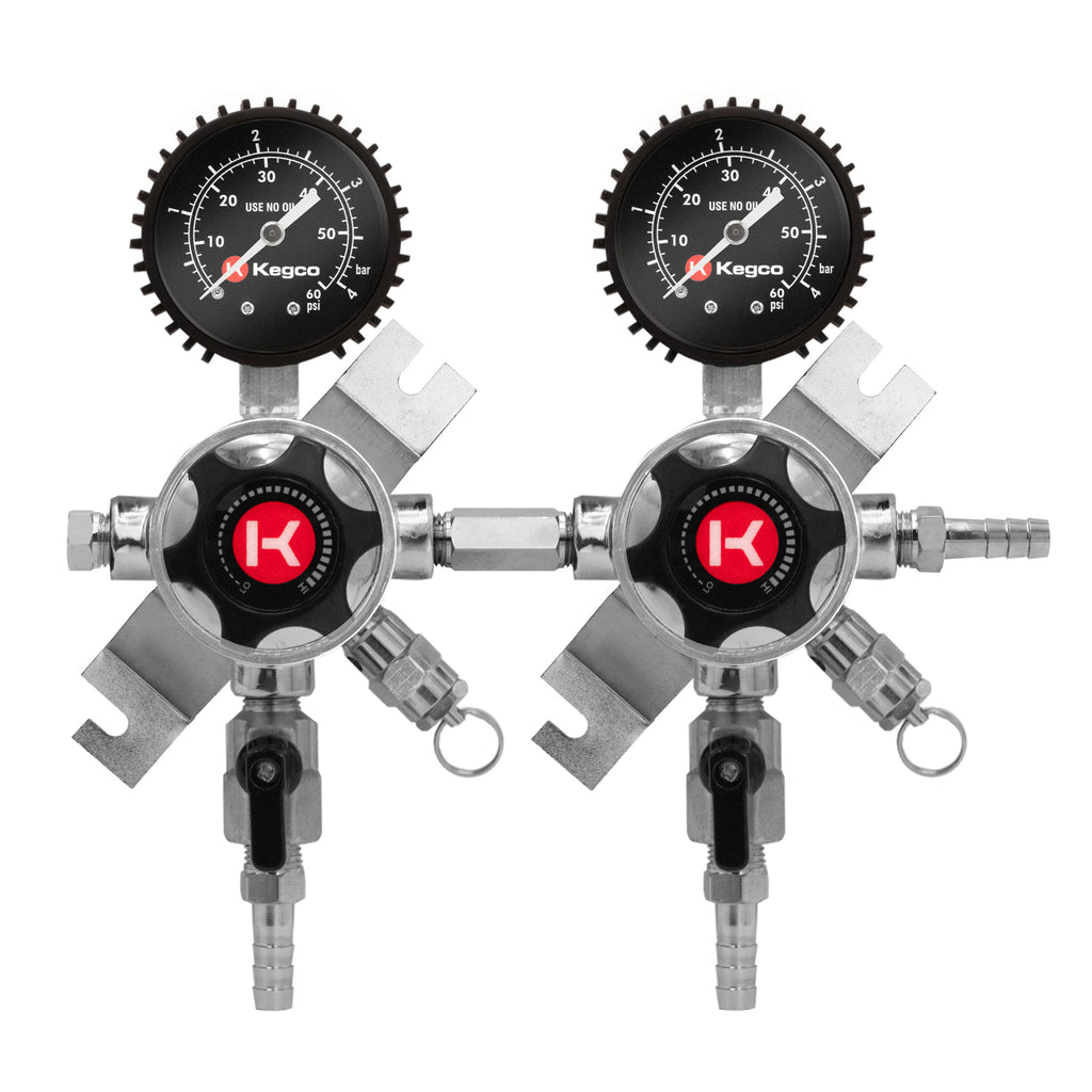This regulator's sophisticated design boasts two bold black gauges with high-contrast red and white text that is both stylish and easy to read. Two matching black plastic handles and black shut-off knobs add to the sleek look.