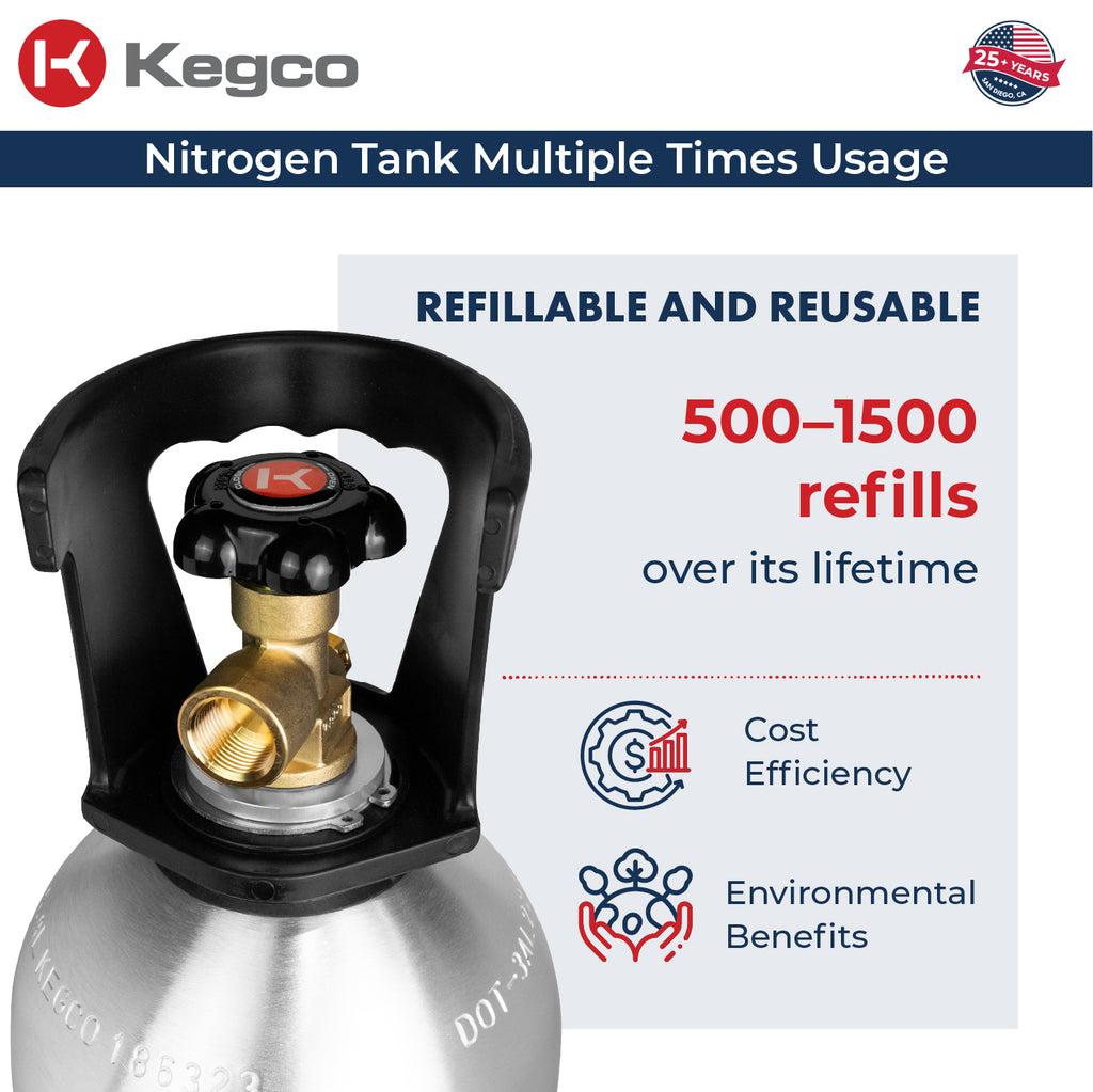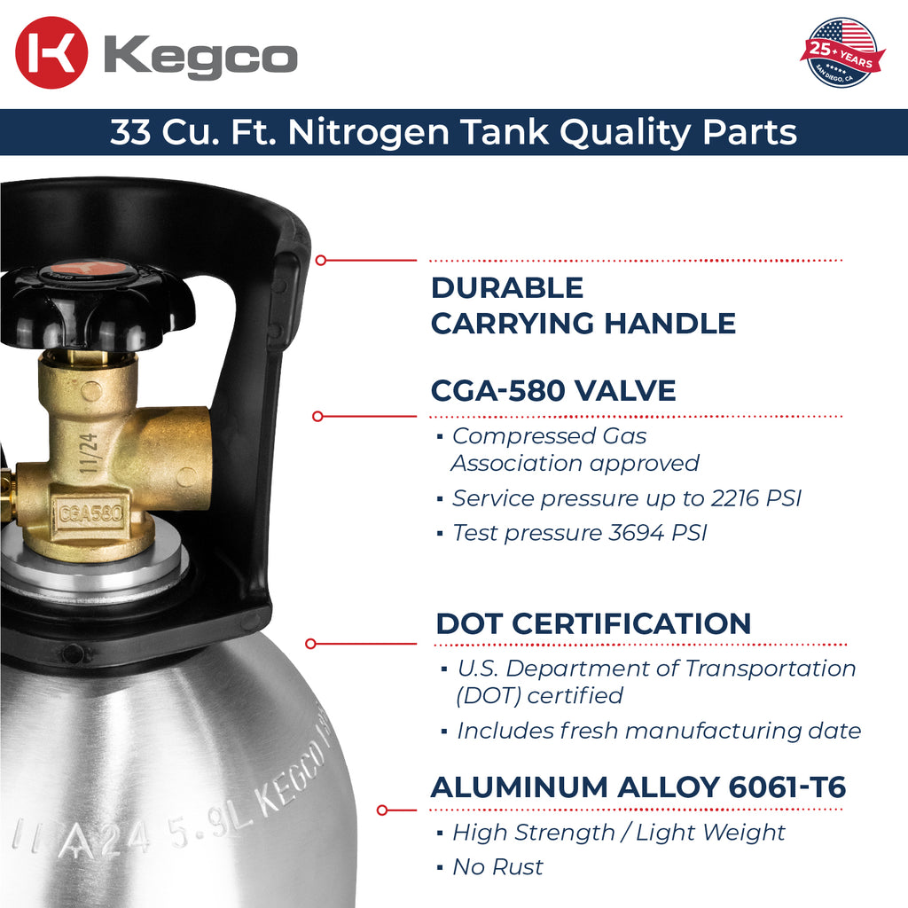 The Kegco 33 Cu. Ft. nitrogen air tank is constructed of high strength aluminum alloy 6061-TS and come equipped with a carrying handle. This tank is a popular choice because it is not as heavy as a steel tank and will not rust. The service pressure of this air tank is up to 216 PSI/153 BAR. These cylinders are stamped with required U.S. Department of Transportation and Transport Canada markings. The 580 valves are CGA approved, and have a female thread for Nitrogen Regulators.